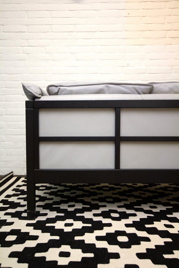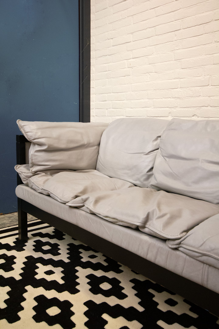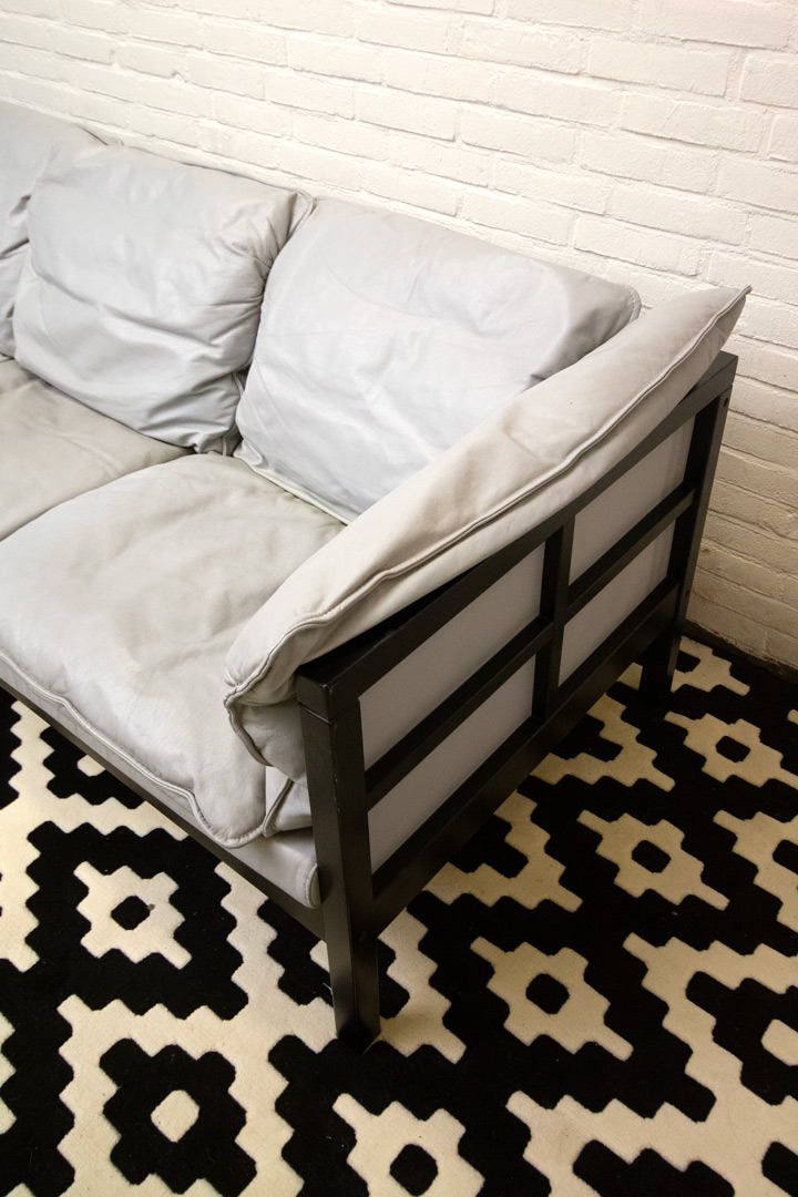 Retro of vintage driezitsbank Ikea bank met grijs leer en zwart houten frame in een soort Japanse Shoji-stijl. De rechte lijnen en de open vlakken doen denken aan de papieren ‘muren’ of schermen uit de traditionele Japanse architectuur.