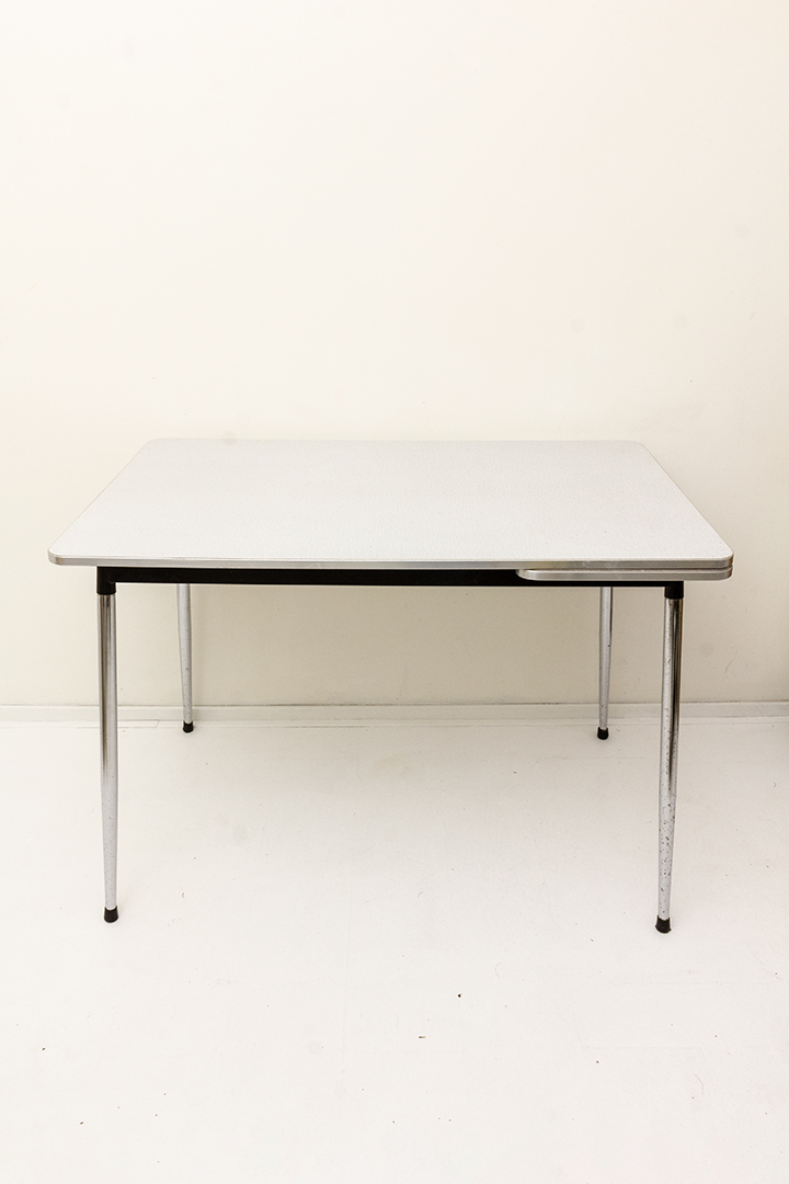 Deze vintage eettafel is een duurzame aanwinst voor je interieur. Het blad is gemaakt van grijs gemêleerd formica, een materiaal wat veel gebruikt werd in de jaren 50 en 60. Het is een kunsthars die ontzettend krasvast is. Formica is niet stuk te krijgen en kun je daarnaast gemakkelijk schoonmaken. Je hoeft er eigenlijk alleen maar een doekje overheen te halen. Perfect als eettafel dus!