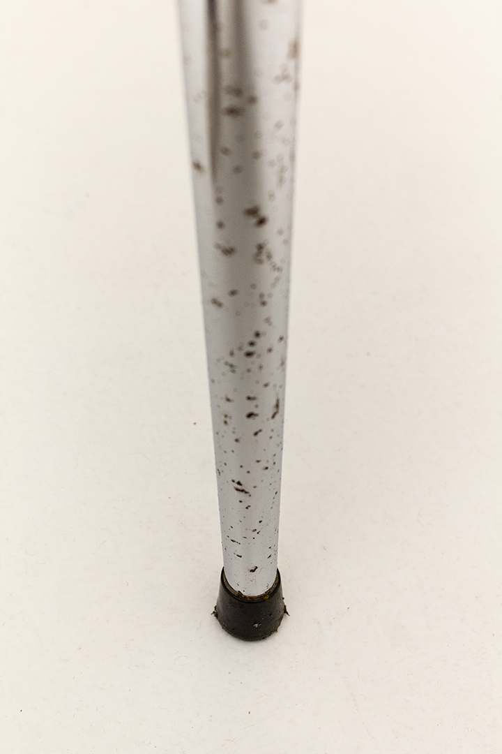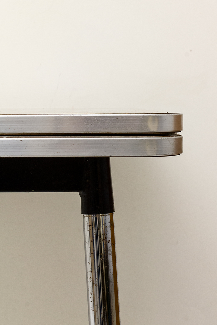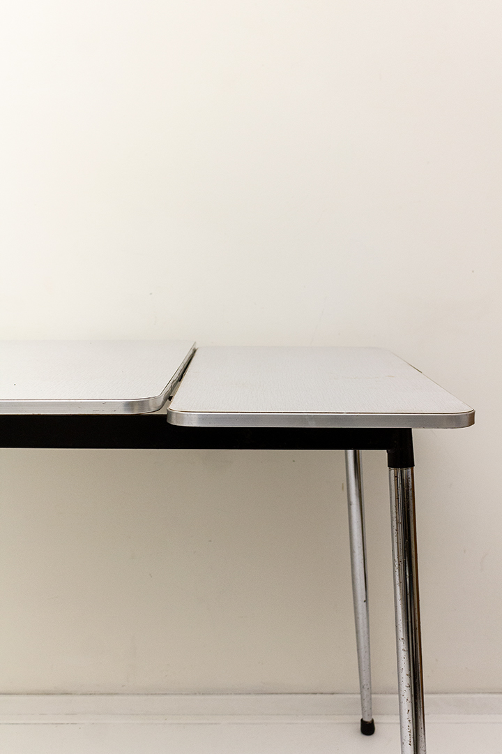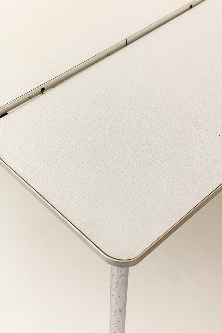 Dit exemplaar heeft een uitschuifbaar blad. Je maakt van een kleine tafel in een handomdraai een eettafel waar je ook een aantal gasten aan kwijt kunt. De poten van deze vintage formica tafel zijn van metaal. Ze vertonen wat oxidatie-plekken. De eettafel verkeert verder in goede staat.