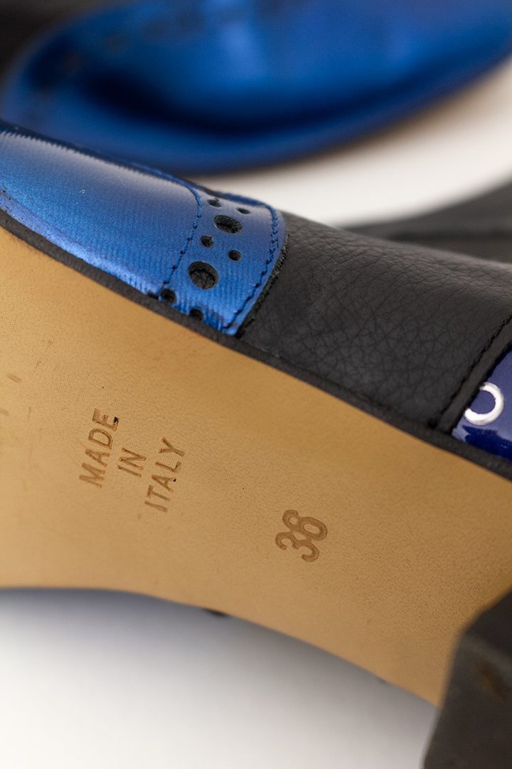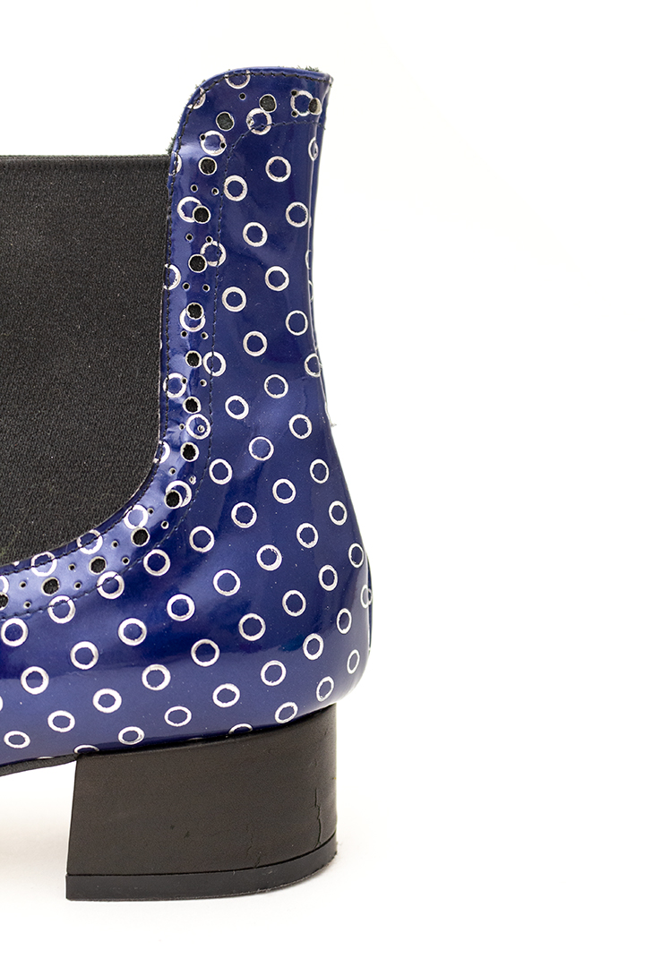 Hele chique vintage enkelaarzen met bijzondere geperforeerde details. Deze laarzen zijn van het merk Jodiel David Moresco en ze werden gemaakt in Italië. In de basis bestaan de schoenen uit zwart leer. De neus is bekleed met met blauw lakleer, en ook op de hiel zien we dit materiaal (inclusief cirkelpatroon) terug. Erg mooi! De laarzen hebben aan zowel de binnen- als buitenzijde een stuk elastiek. Zo trek je ze gemakkelijk aan.