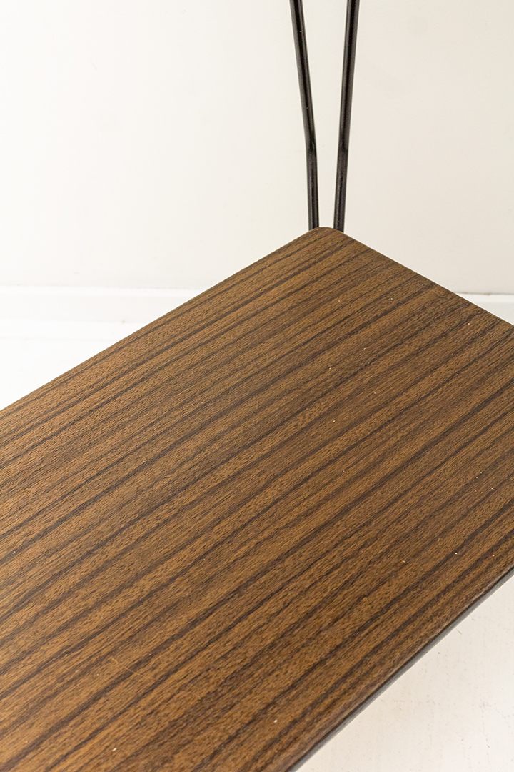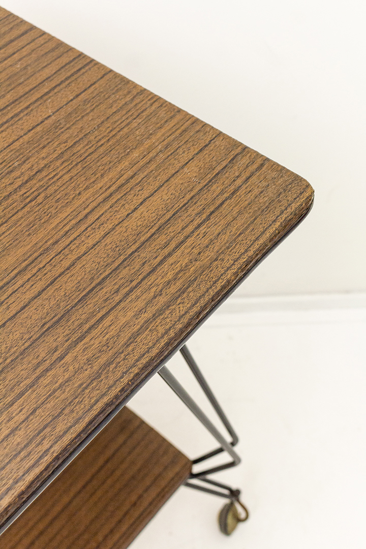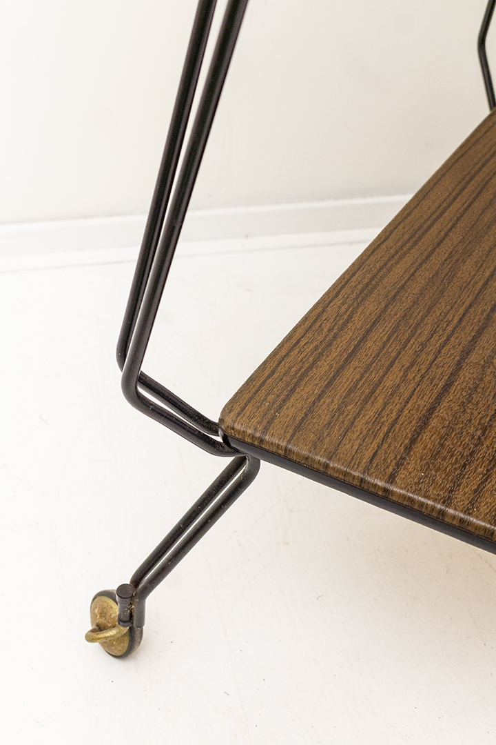 Een vintage trolley met een wel heel bijzonder frame. De draadstalen poten van deze bijzettafel hebben een mooie architectonische uitstraling door de hoeken die het metaal maakt. De bijzettafel staat op wieltjes. Er zijn twee tafelbladen, beiden bekleed met vinyl in een hout-look.