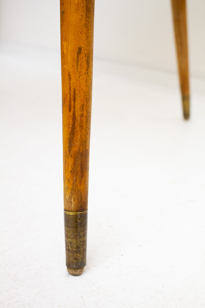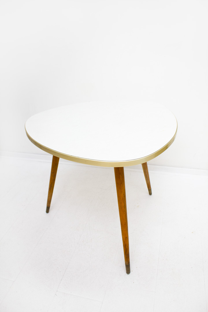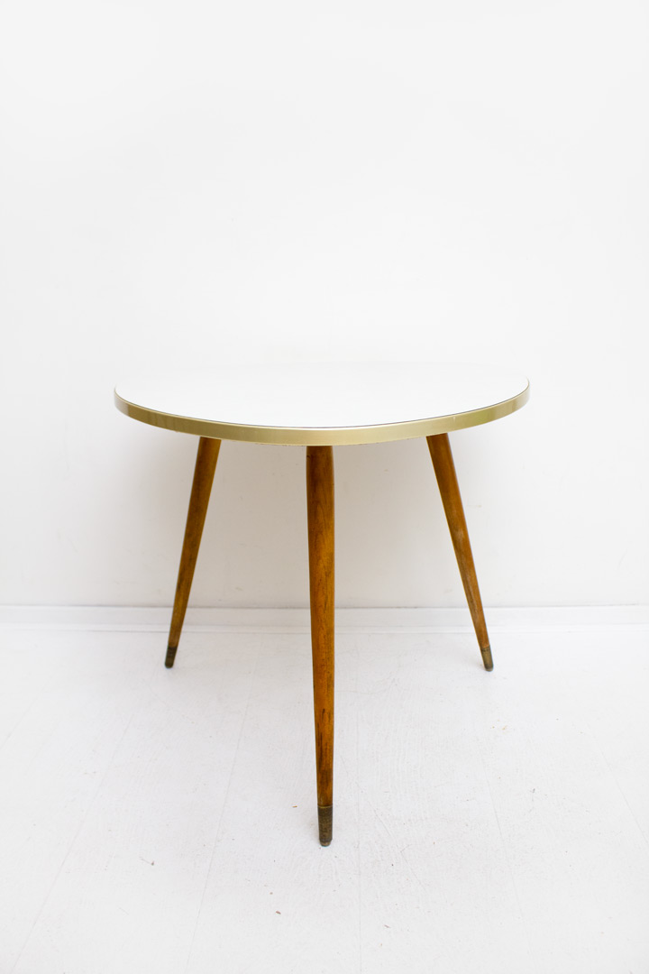 Deze vintage driepoot bijzettafel combineert de schoonheid van hout met de duurzaamheid van Formica. De sierlijke houten poten dragen het formica blad, dat afgewerkt is met een goudkleurige metalen rand. Het totaalplaatje is een leuk meubelstuk dat zich in elke ruimte thuis zal voelen.