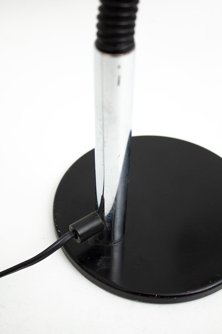 Een klassieker op je bureau: vintage Hala Zeist lamp model 751 ontworpen door Herman Busquet. De zilverkleurige metalen kap en zwarte details geven de lamp een herkenbare industriële uitstraling waar Hala bekend om staat. De flexibele zwarte buigarm zorgt ervoor dat je het licht precies kunt richten waar je het nodig hebt.