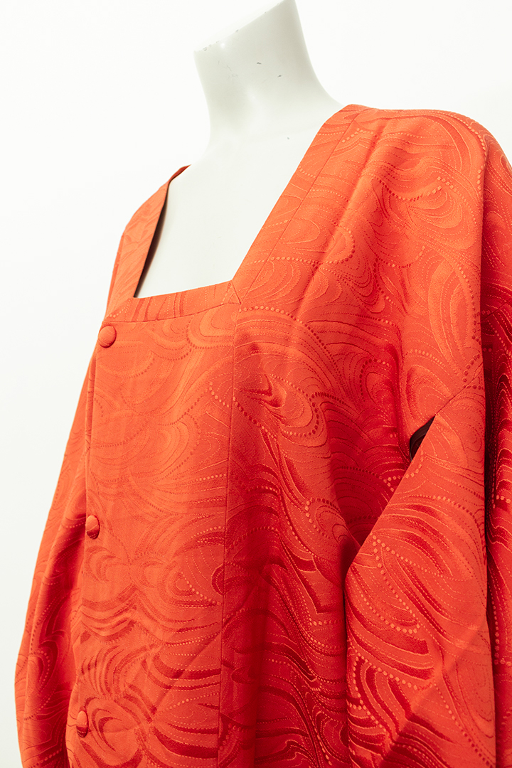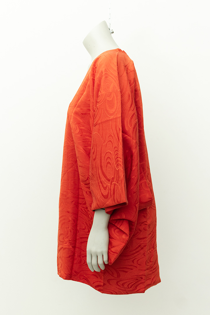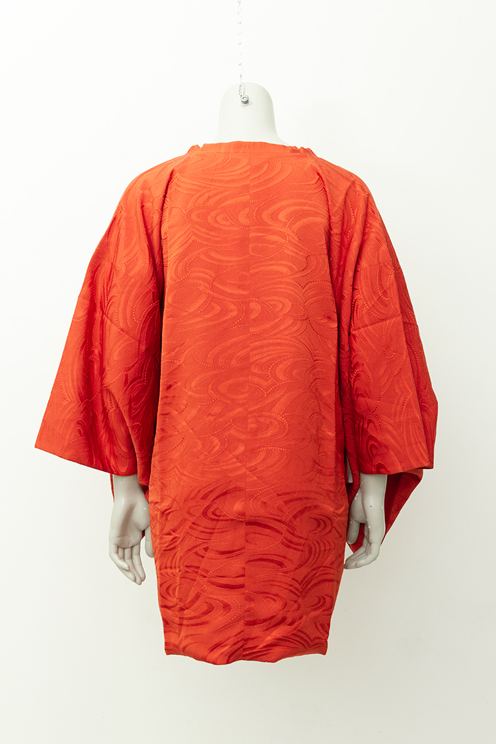 Mooie vintage lichte haori gemaakt van gladde stof. Deze korte kimono is rood en voorzien van een sierlijk dessin. De binnenzijde is gevoerd met een stof in traditionele Japanse print. Het item sluit met drie knoopjes aan de voorzijde. Perfect als luchtige jas voor warme dagen, maar ook heel fijn als kamerjas voor thuis.