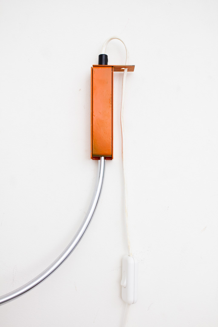 Zowel de boog als de oranje kap kunnen verschillende kanten opgedraaid en gekanteld worden. De lamp is eenvoudig te monteren d.m.v een ijzeren plaatje dat je aan de muur kunt schroeven, hier schuif je vervolgend gemakkelijk de lamp op om op te hangen.