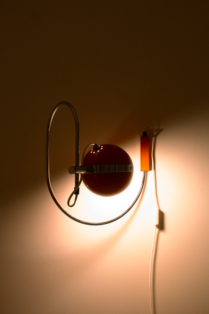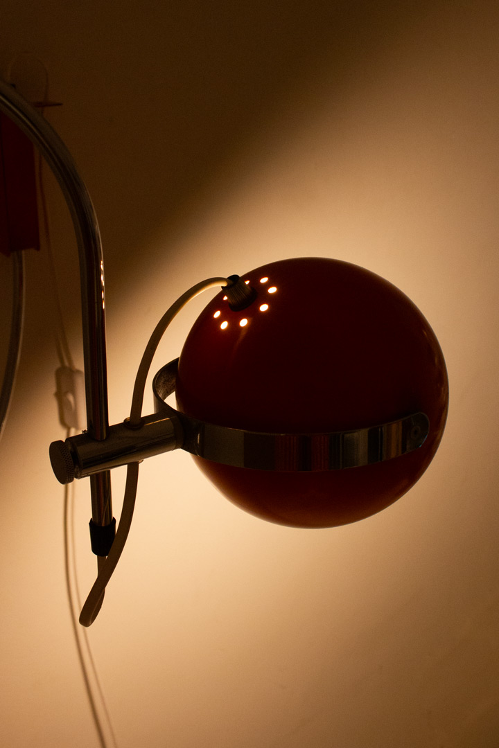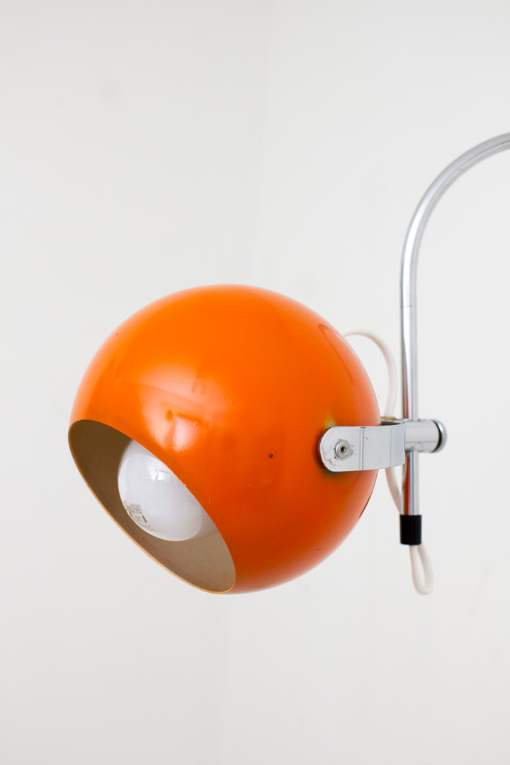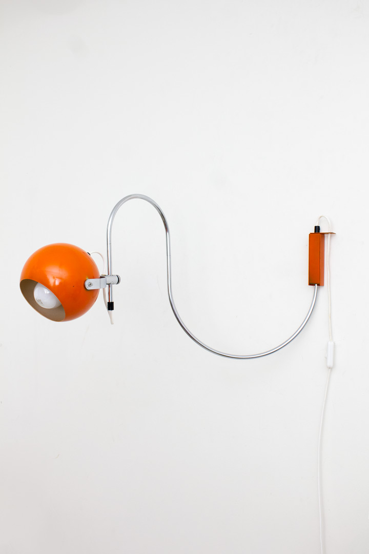Dit is pas een echte vintage parel! Deze prachtige jaren 70 Herda Space-Age wandlamp is een unieke vondst. De oranje eye-ball lampenkap, de chromen body en organische vormen, alles schreeuwt Space-Age.