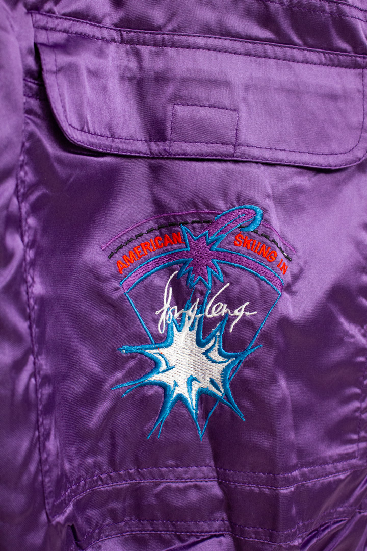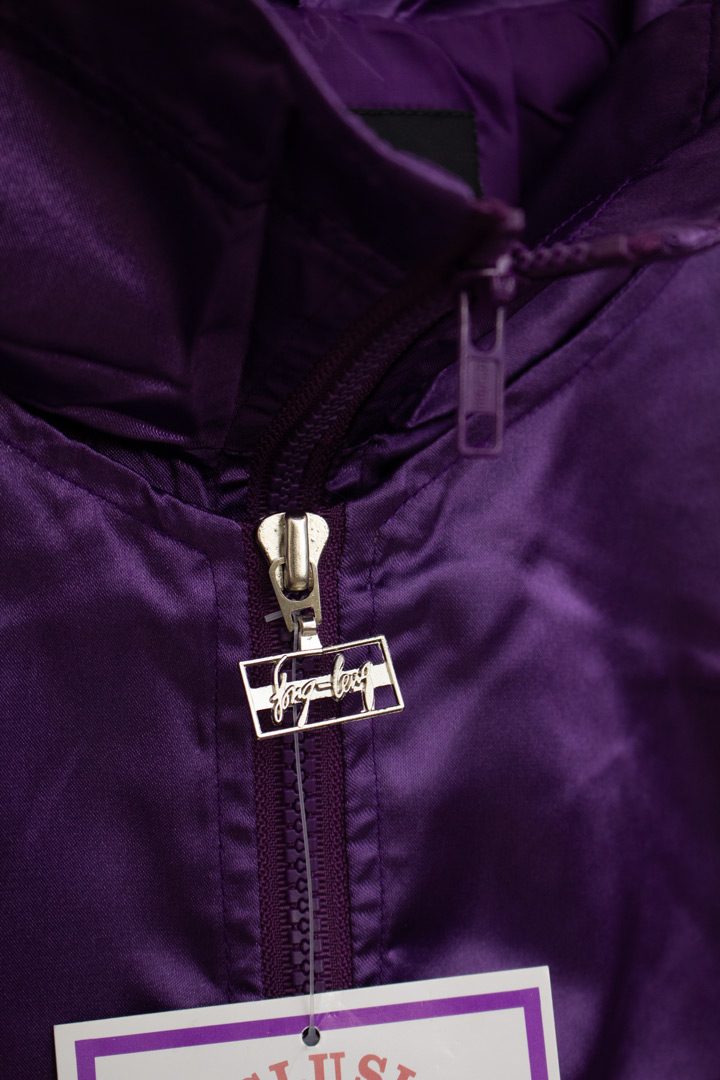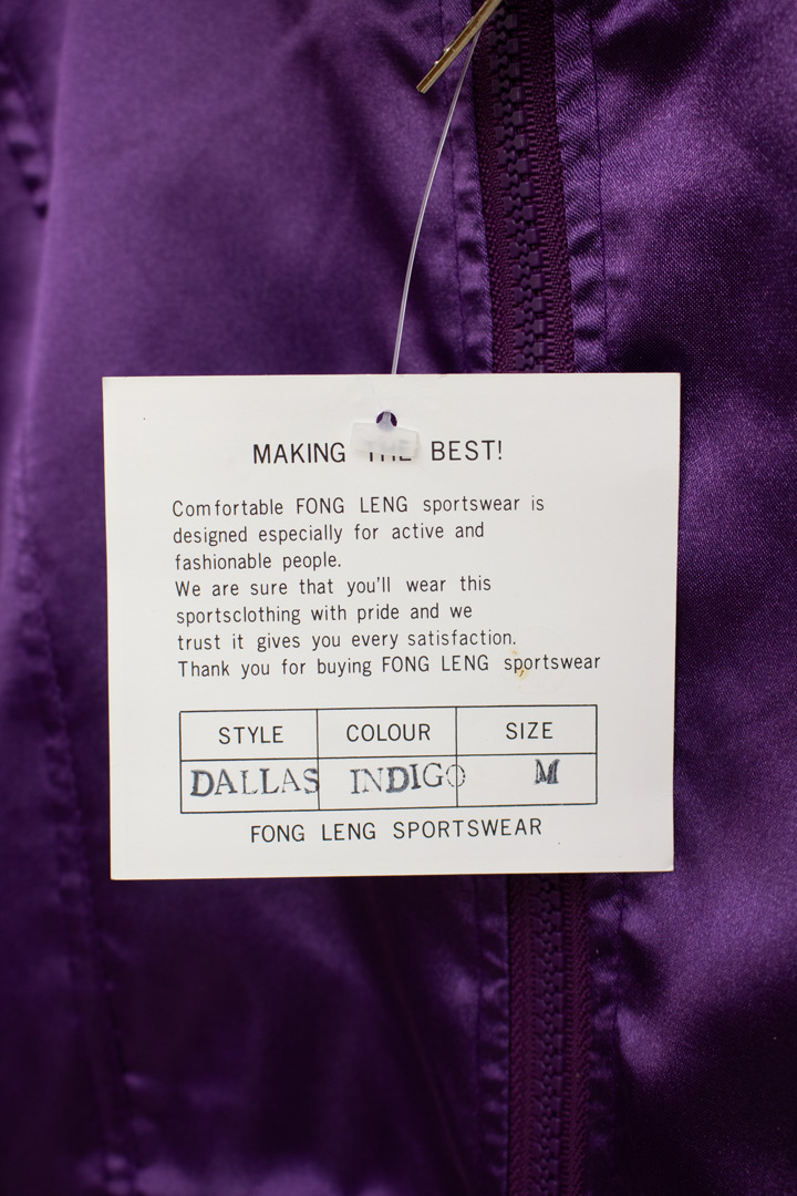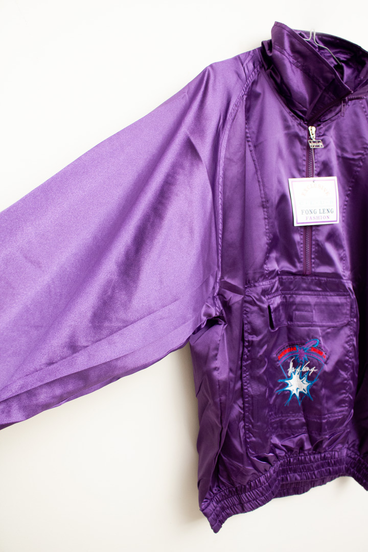 Met deze jaren 80 jas val je op! En dat is precies de bedoeling van de ontwerper Fong Leng: haar designs zijn extravagant en heel kleurrijk. Het jack is vrij dun, gemaakt van indigo nylon en glanst je tegemoet. Je trekt de jas aan over je hoofd. Het item heeft een flinke kraag, twee ritssluitingen en een zak op de buik. De jas valt lekker oversized en heeft een elastieken band rond de mouwen en op de heup. Je kunt het jack als jas over een wollen trui dragen, maar hij staat ook perfect als trui. Vintage jaren 80 ten top!