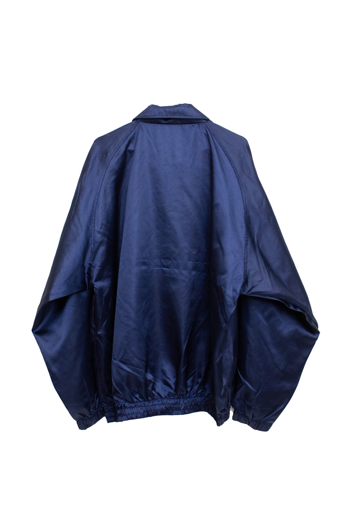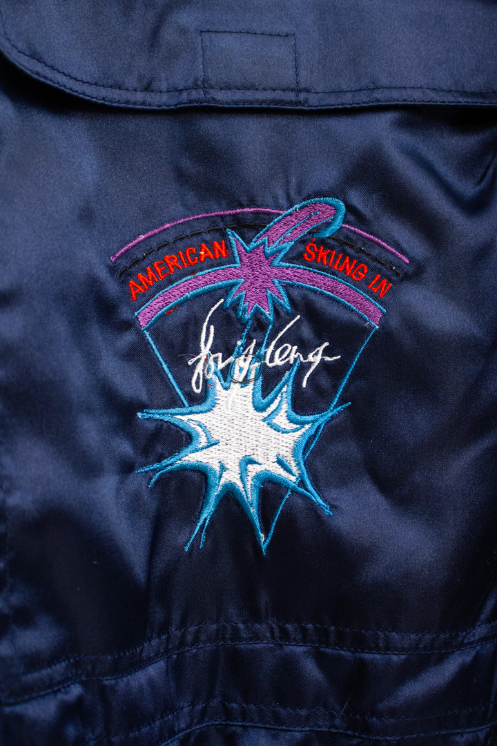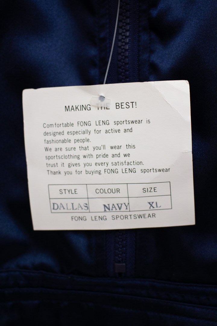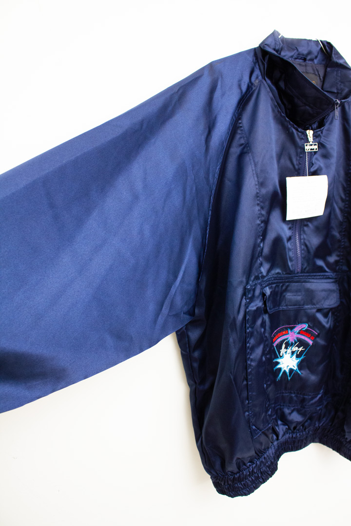 Met deze jaren 80 jas val je op! En dat is precies de bedoeling van de ontwerper Fong Leng: haar designs zijn extravagant en heel kleurrijk. Het jack is vrij dun, gemaakt van navy nylon en glanst je tegemoet. Je trekt de jas aan over je hoofd. Het item heeft een flinke kraag, twee ritssluitingen en een zak op de buik. De jas valt lekker oversized en heeft een elastieken band rond de mouwen en op de heup. Je kunt het jack als jas over een wollen trui dragen, maar hij staat ook perfect als trui. Vintage jaren 80 ten top!