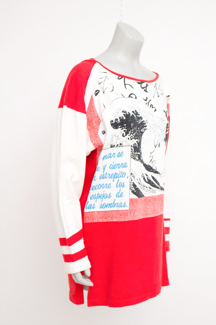 Dit rood-witte oversized t-shirt met lange mouwen is een prachtig voorbeeld van Yamamoto’s werk. Op de voorkant zie je een illustratie in Japanse stijl met golven en Japanse karakters. Ook is er een kader met blauwe tekst in het Spaans. De achterkant van het t-shirt is open, waardoor een deel van je rug zichtbaar is. De kleurvlakken en lijnen in dit ontwerp geven het t-shirt een stoere uitstraling.