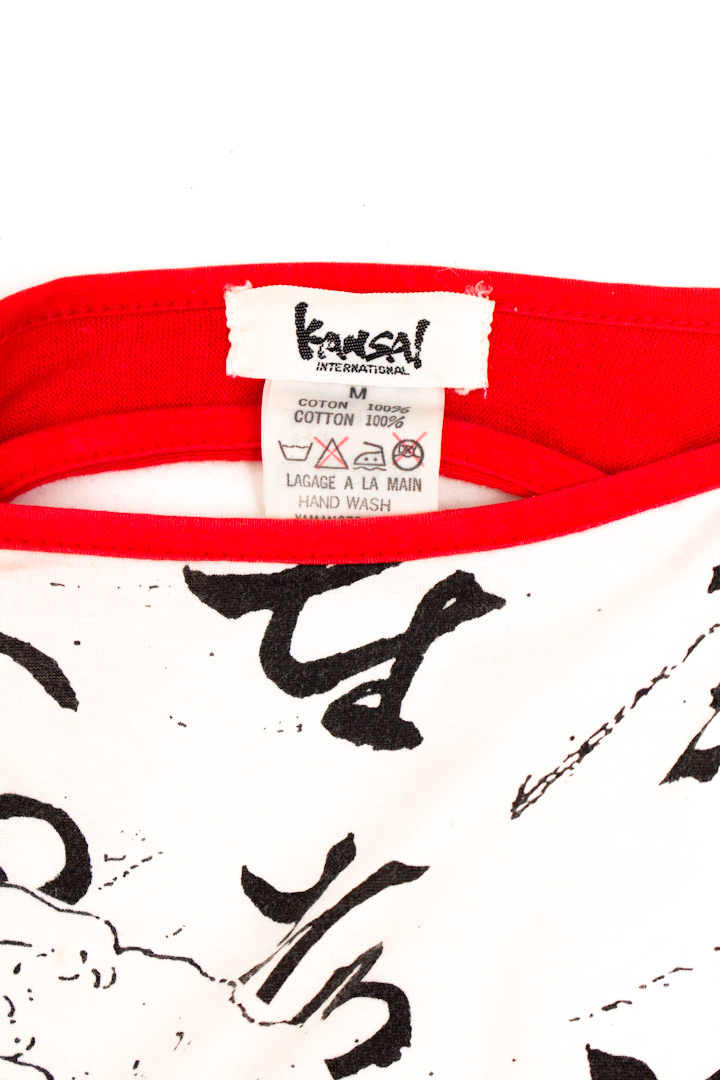 Een uniek vintage katoenen t-shirt van modeontwerper Kansai Yamamoto. Yamamoto is een van de grootste Japanse designers, bekend van zijn opvallende streetwear ontwerpen uit de jaren zeventig en tachtig. In zijn kledingstukken combineert Yamamoto oosterse en westerse invloeden tot een stoer en kleurrijk geheel. Zijn ontwerpen waren — en zijn nog steeds — erg geliefd. David Bowie droeg zijn designs graag!