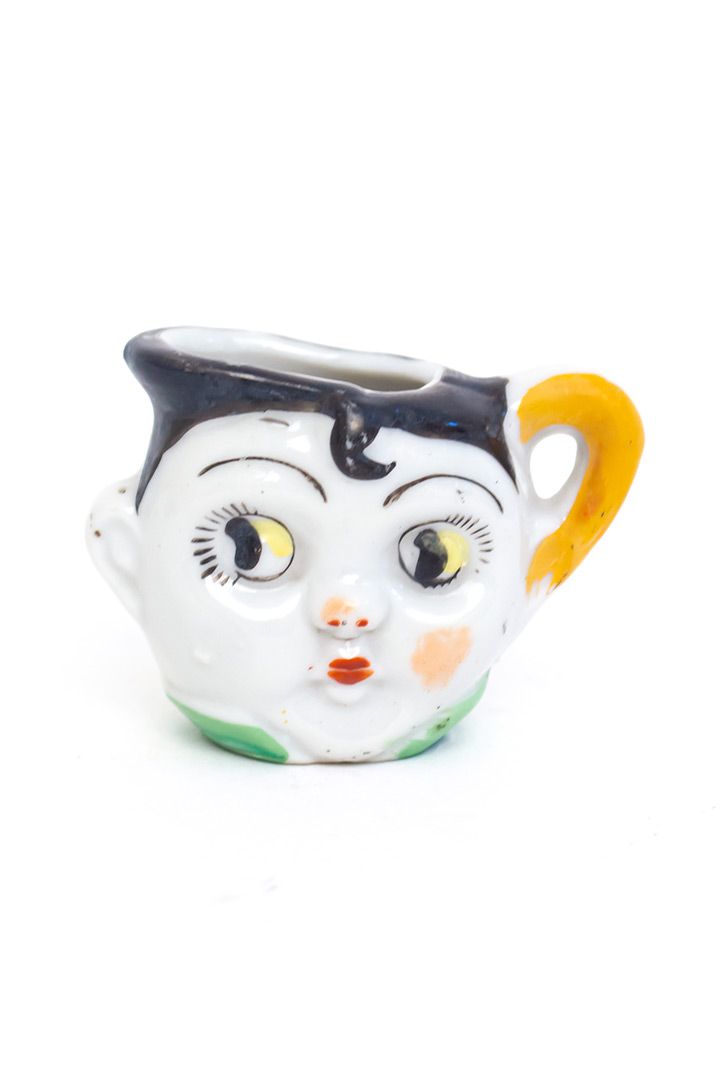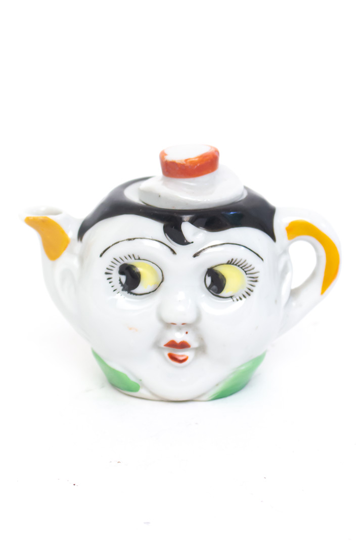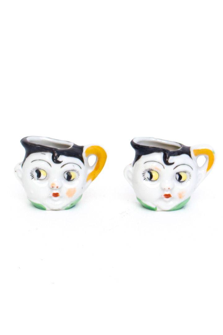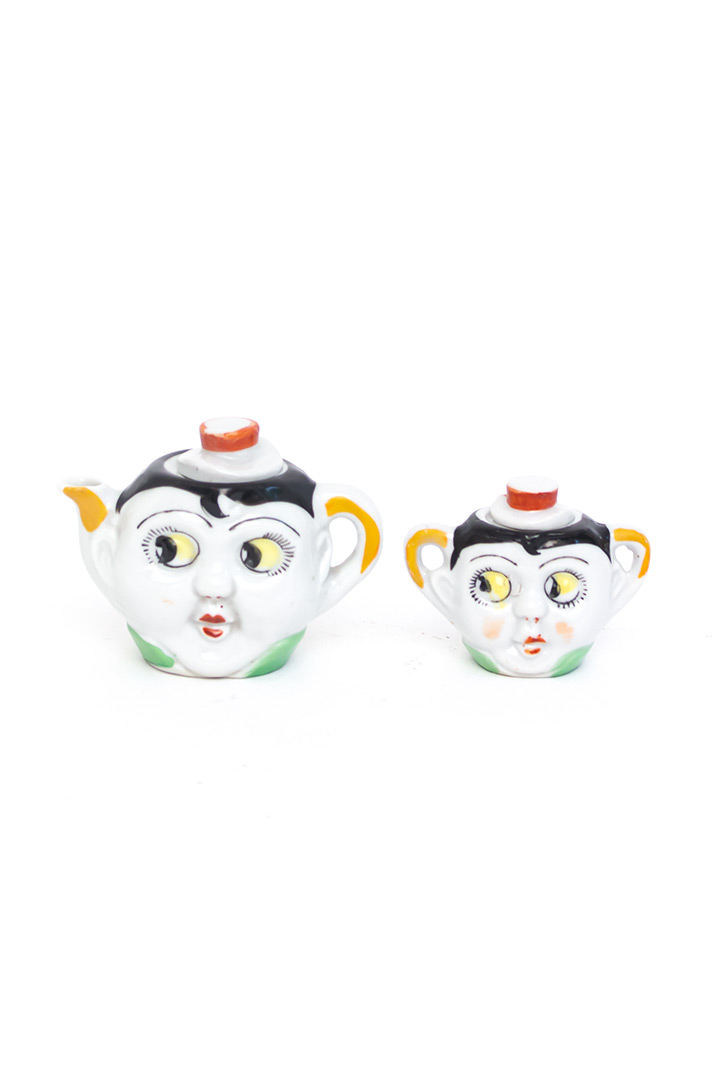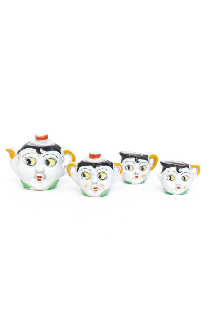 Dit lieve vintage kinderservies bestaat uit een miniatuur theepot, suikerpot en twee kopjes. De set komt uit de jaren 20 en is gemaakt van keramiek. Het servies is opvallend kleurrijk ingeschilderd. Vier schattige gezichtjes met vrolijke googly eyes kijken je guitig aan. De rode lippen, opvallende wimpers en zwarte krul op het voorhoofd geven dit setje extra detail!