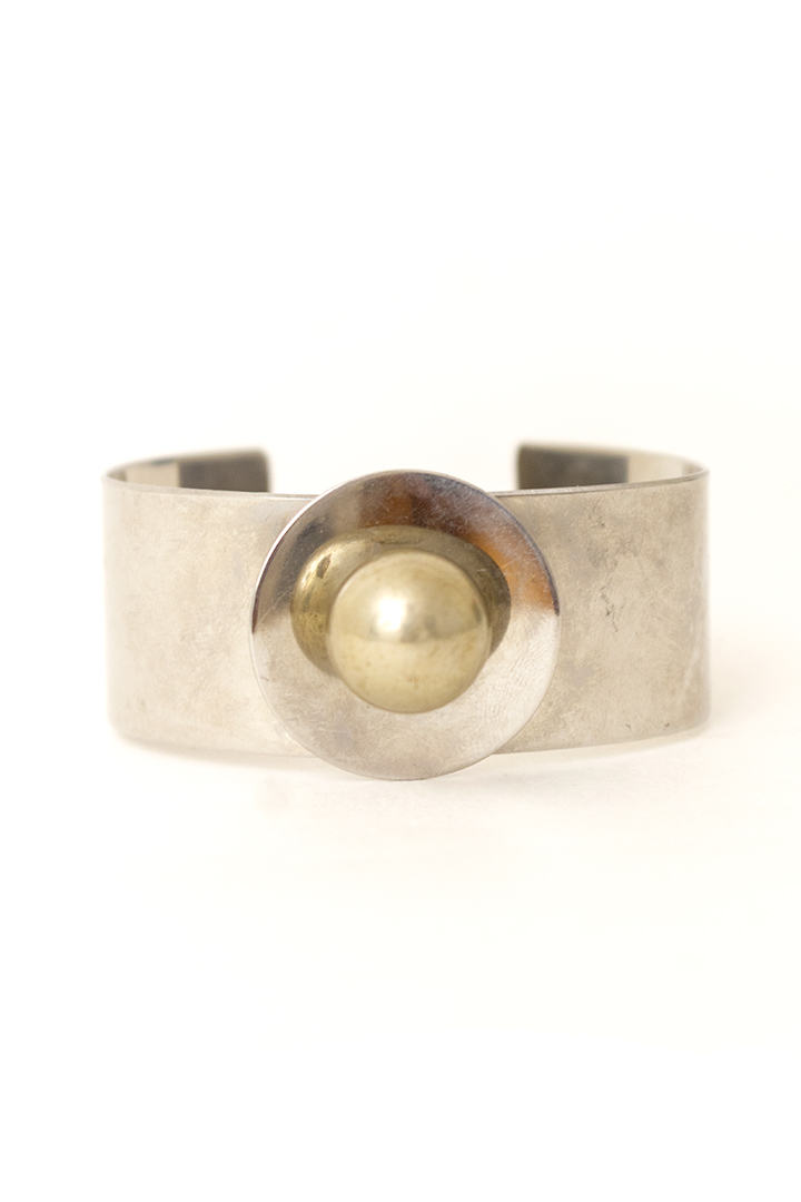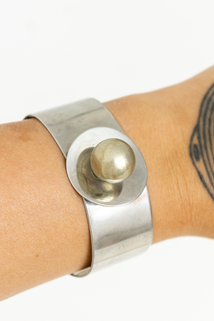 Toffe vintage manchet armband, gemaakt van zilverkleurig metaal. Deze armband heeft een robuuste vorm met een elegant bolletje bovenop. Een erg leuk design!