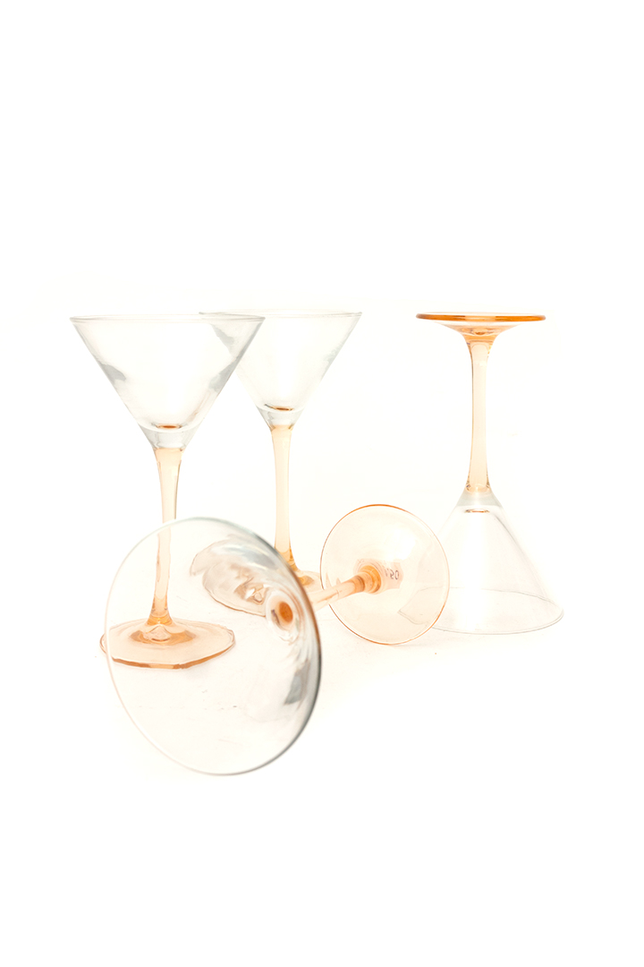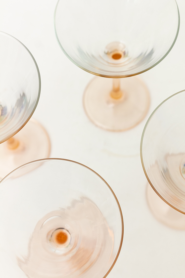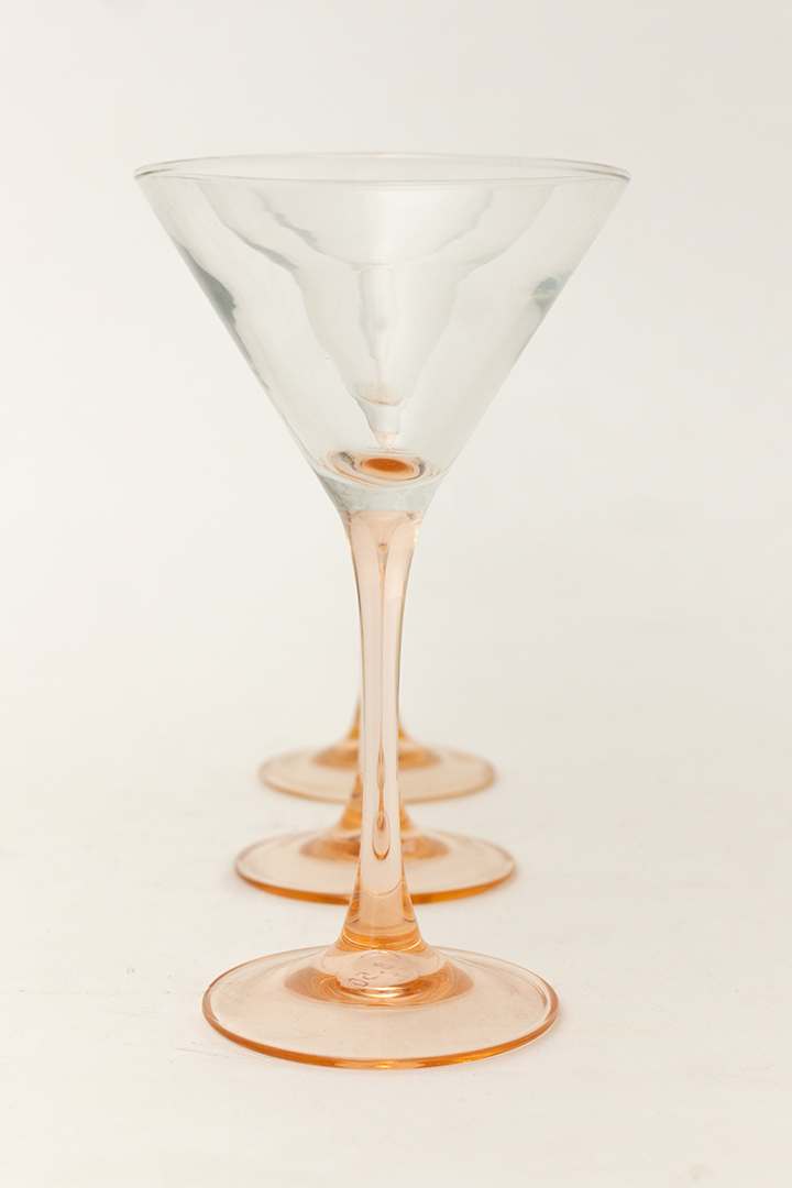 Een Martini drink je in stijl, vind je ook niet? Deze vintage Martini glazen staan prachtig met zo’n drankje en een prikkertje olijven erin. De glazen hebben een klassieke uitstraling en een roze gekleurde steel en voet.
