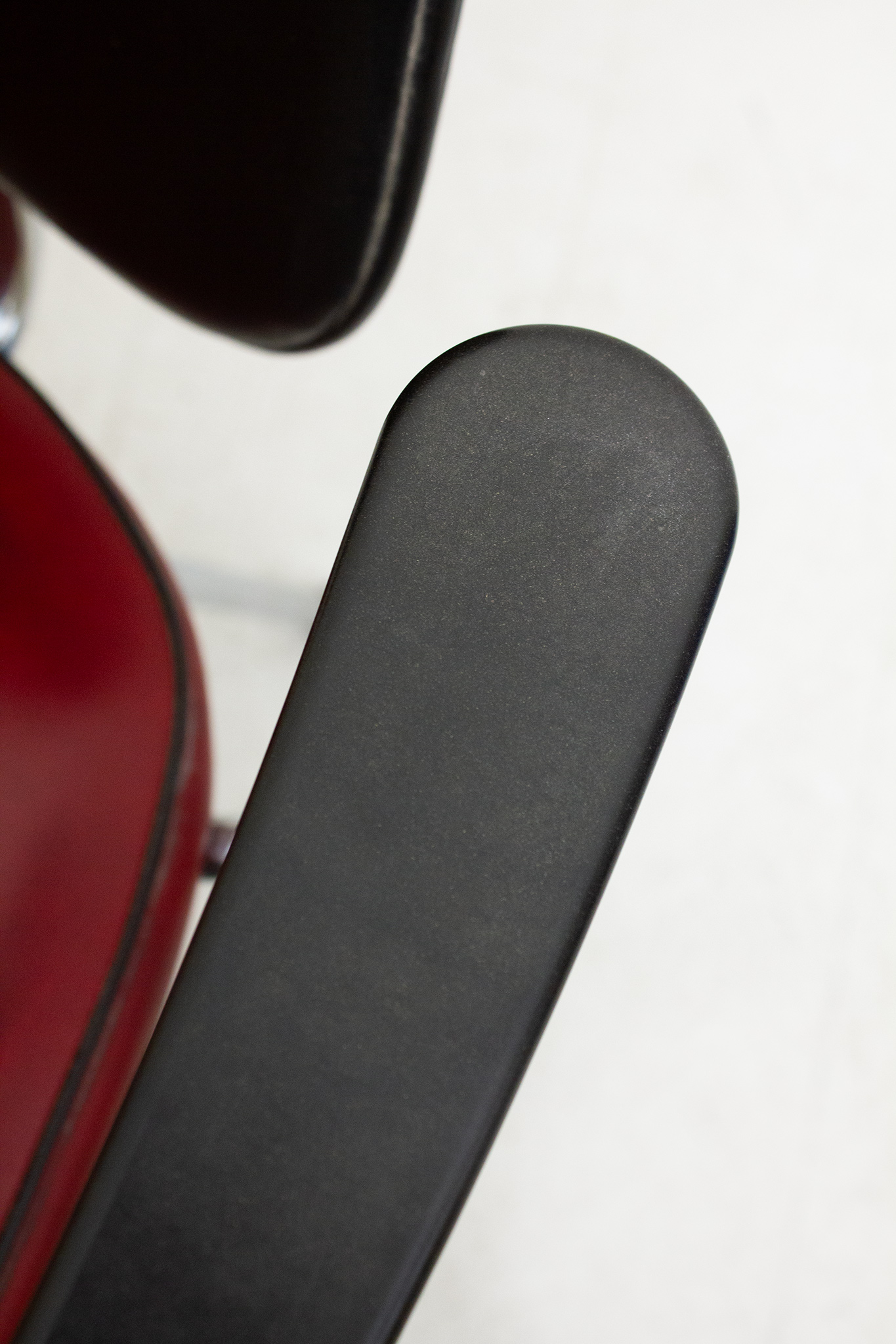 De stoel staat op elegante dunne metalen poten. De rugleuning is gemaakt van zwart skai leer. Het grote zitvlak is met rood skai leer bekleed en afgebiesd in het zwart. Hierdoor wordt het contrast tussen de delen iets subtieler. De armsteunen van de stoel zijn gemaakt van zwart kunststof, maar krijgen door de gemêleerde kleur een ijzerachtige uitstraling.