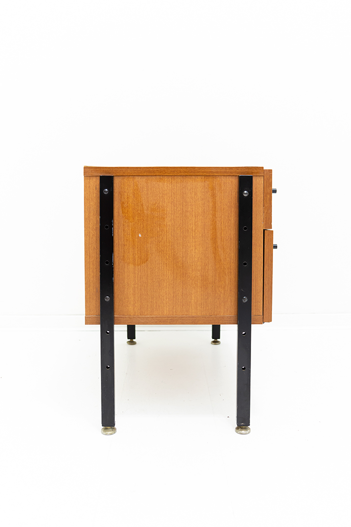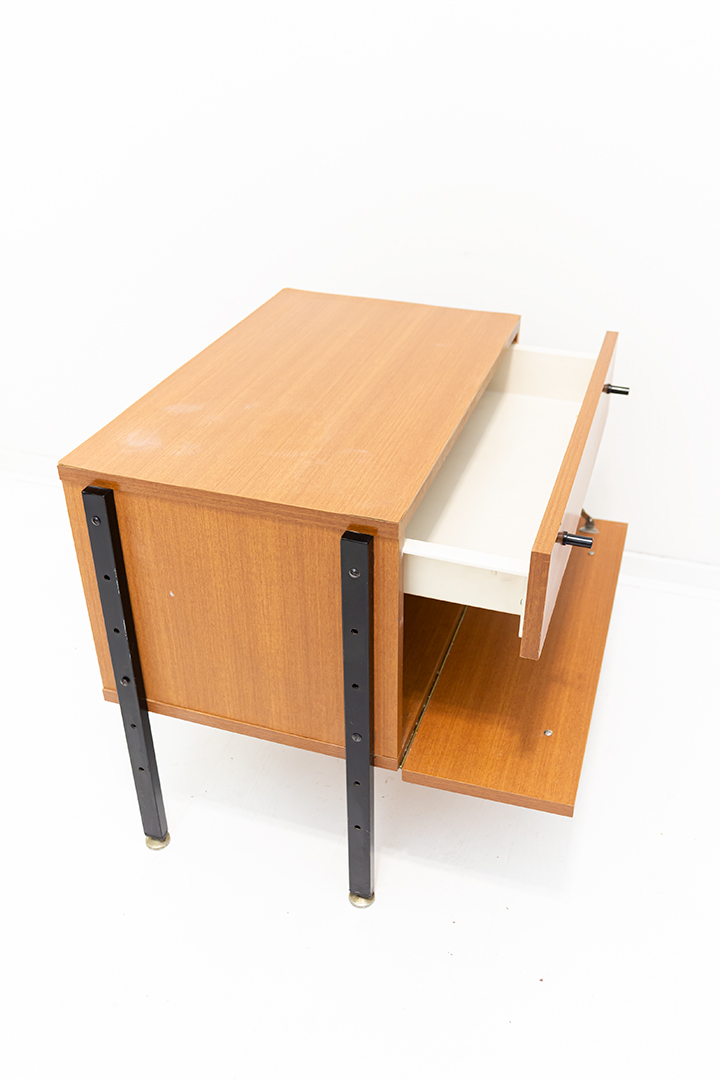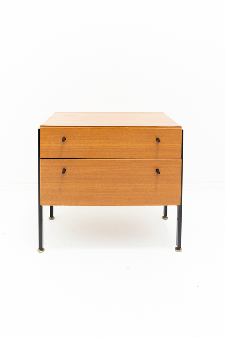 Leuk vintage nachtkastje voorzien van een laag lichtgekleurd houtfineer. Het kastje heeft zwarte metalen handgreepjes en poten die helemaal doorlopen langs de zijkant van het meubel. Een mooi detail!