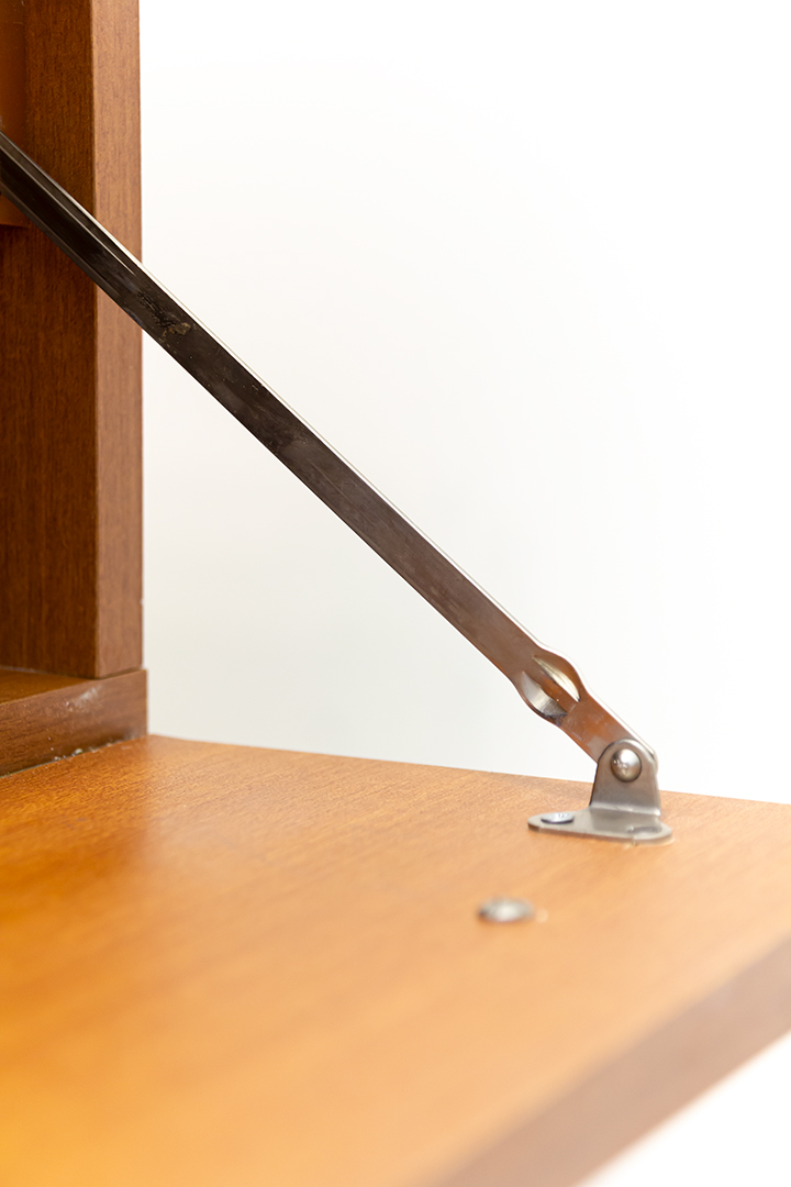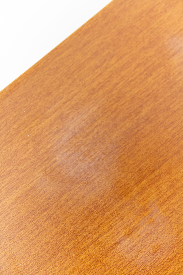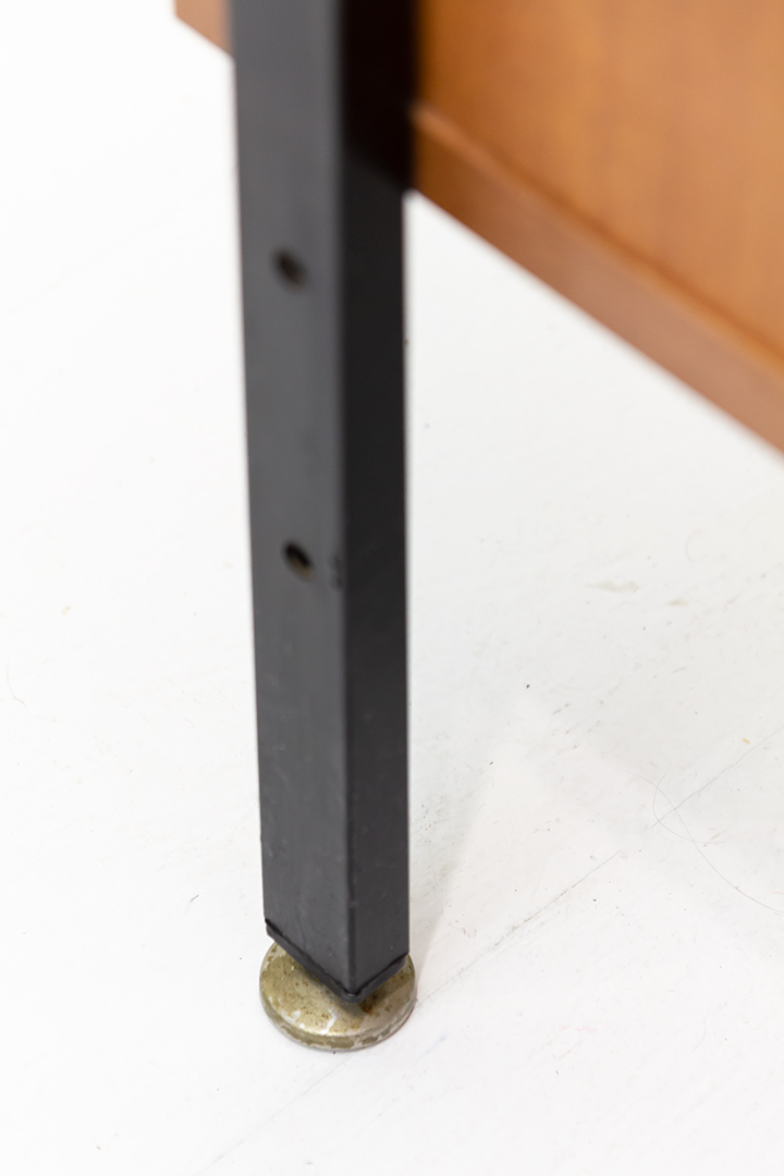 Het nachtkastje verkeert in prima staat. Op de onderste lade aan de rechterkant zit een klein deukje. Het bovenblad heeft lichte vochtplekken en het zwarte metaal lichte gebruikssporen. De ronde zilverkleurige voetjes zijn met de jaren een klein beetje verroest.