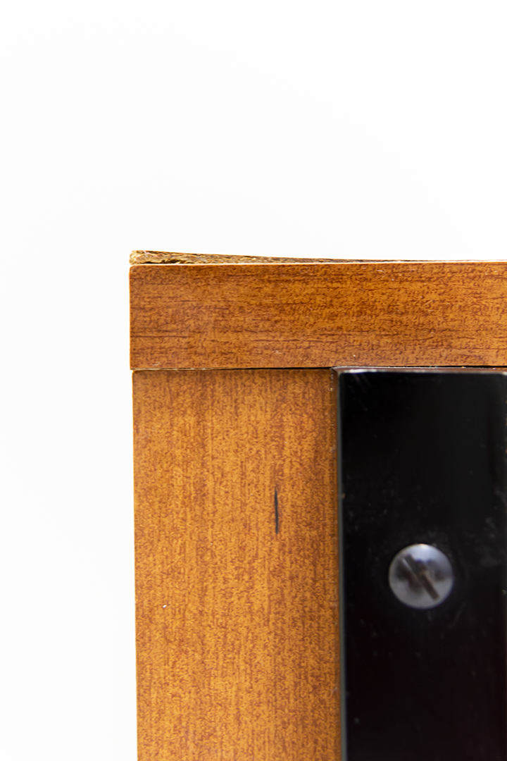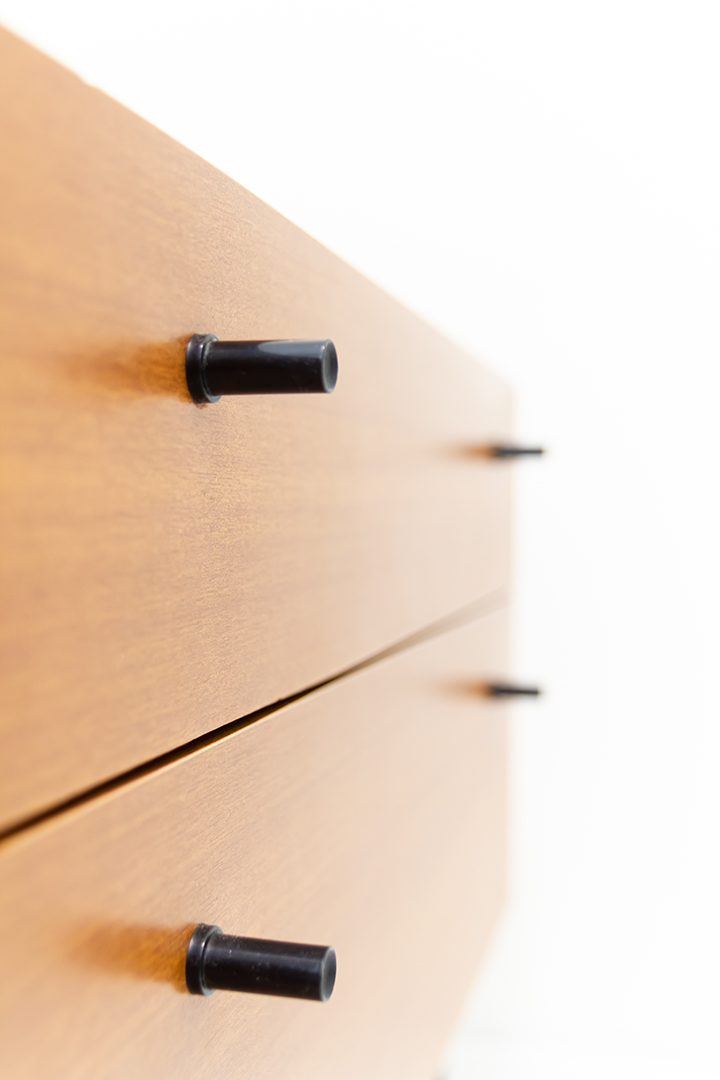 Vintage nachtkastje houtfineer met zwarte handgreepjes