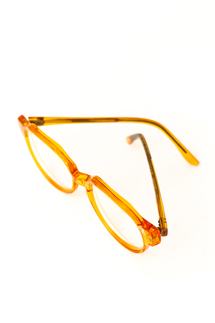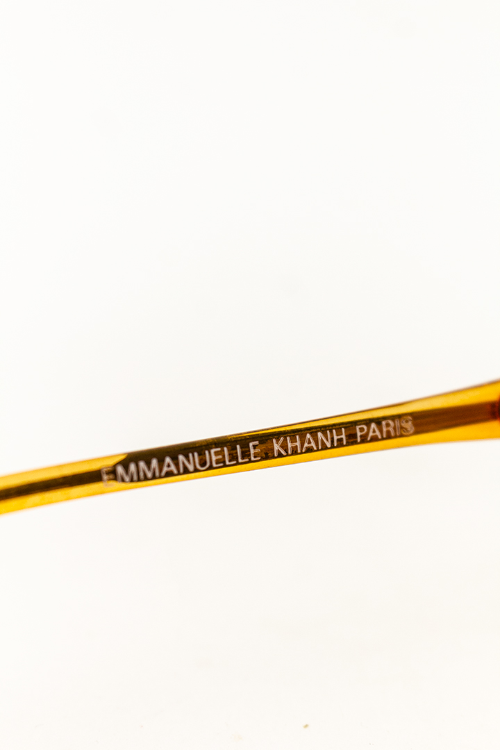 Aan de rechterkant van het vintage montuur zijn de letters EK gegraveerd, een paraaf van Emmanuelle Khanh, de designer. De bril heeft glazen zonder sterkte, waarschijnlijk het originele show-model. Je kunt hem zo dragen als accessoire of laat er glazen op sterkte in zetten.
