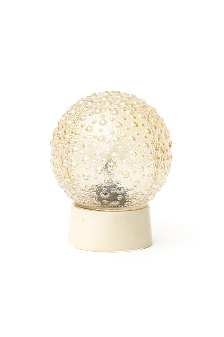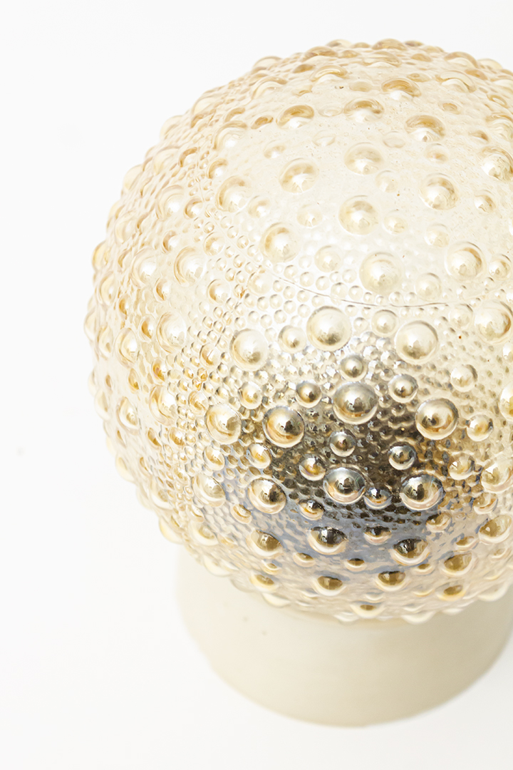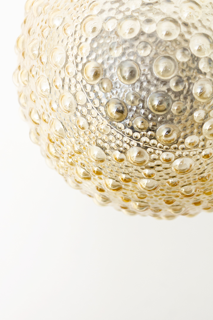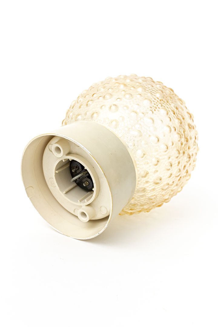 Deze vintage plafonnière is een typisch jaren 70 item. De glazen kap met bubbel-reliëf heeft een iets oranje tint met een soort parelmoer glanseffect. De lamp doet planeet-achtig aan, zeker wanneer je hem aanzet. Hang hem hoog aan het plafond of maak er een wandlamp van.