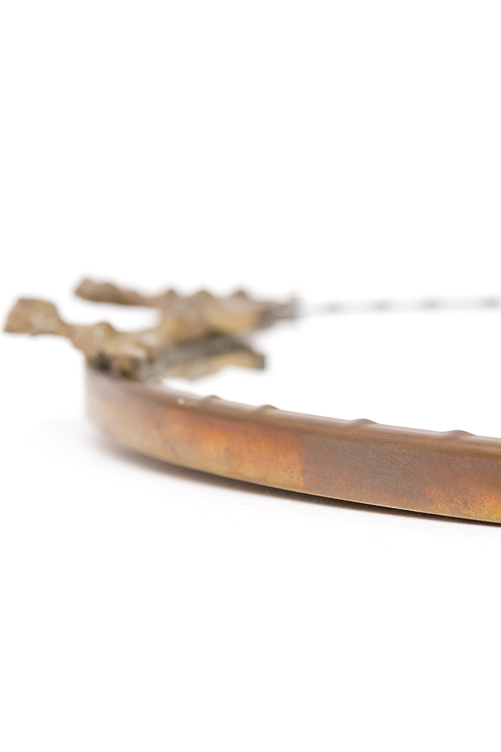 Deze elegante vintage spiegel is ovaal van vorm en voorzien van een luxe messing rand. De decoratieve omlijsting heeft een hoofdje en veel sierlijke krullen geïnspireerd op items uit de barokperiode. De spiegel staat mooi als eye-catcher in verschillende interieur stijlen. Een minimalistische inrichting krijgt direct wat sfeer van, maar de spiegel gaat ook goed samen met items uit de Hollywood Regency stijl.