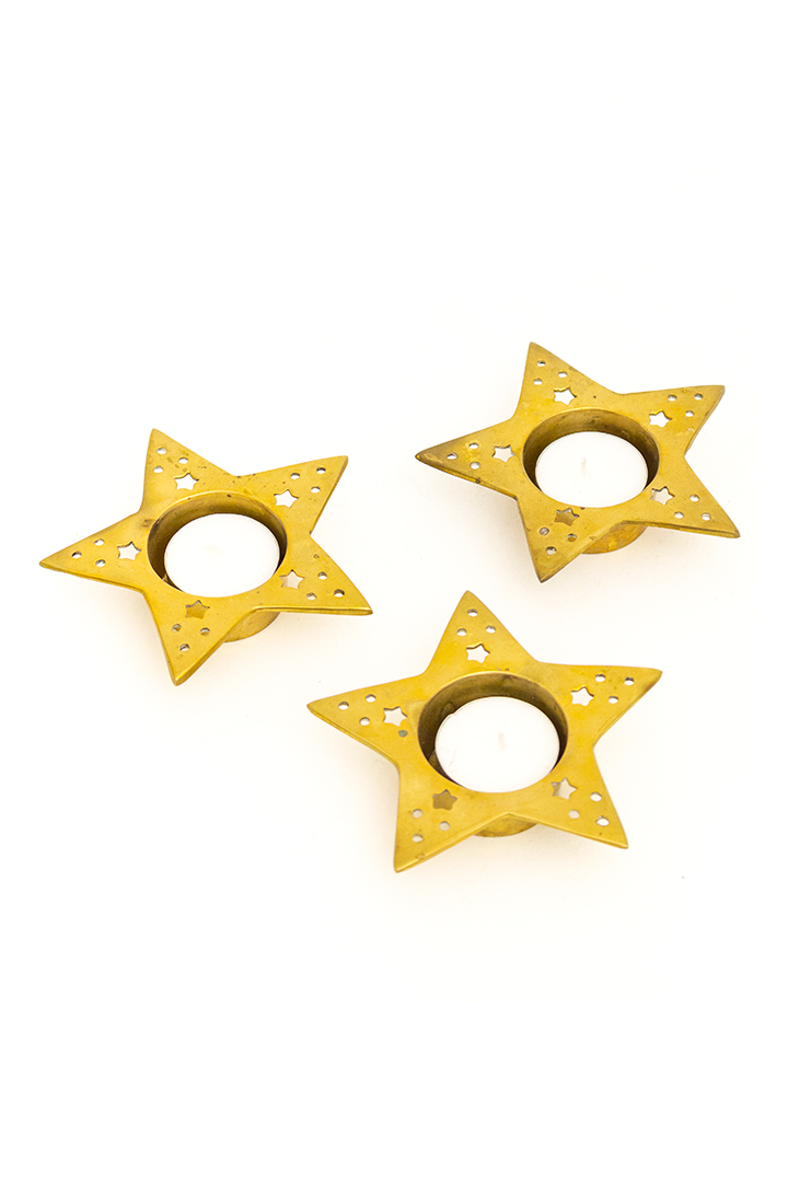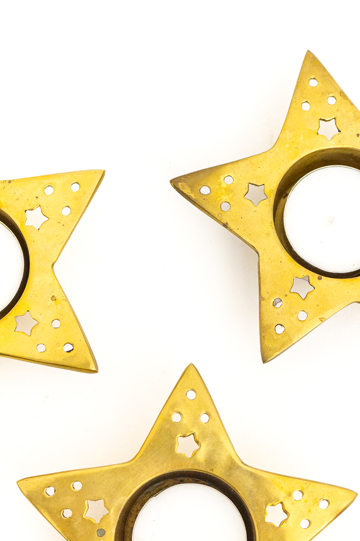 Een perfect winters decoratie-item voor de feestdagen! Deze vintage waxinelichthouders hebben de vorm van sterren. Uit elke sterpunt zijn extra sterretjes en stipjes geponst om de items nog feestelijker te maken. De kaarsenhouders zijn goudkleurig en gemaakt van messing. Ze zijn strak, maar niet té netjes. Door de ietwat organische vormen staan de waxinelichthouders perfect als setje bij elkaar.