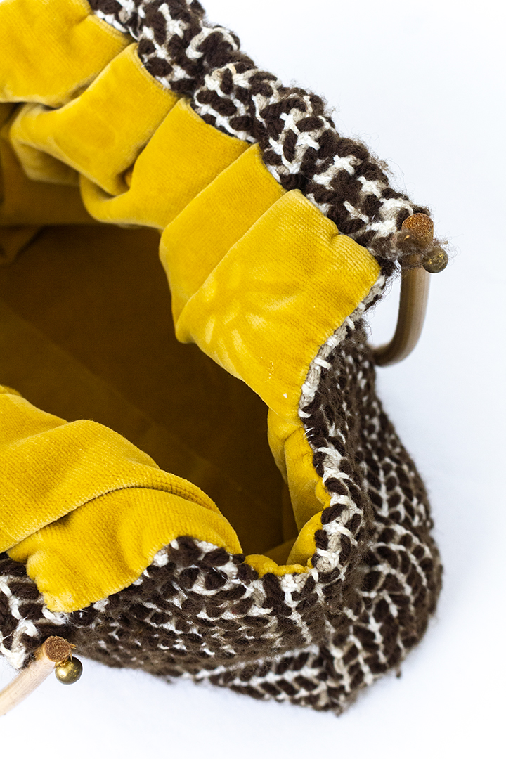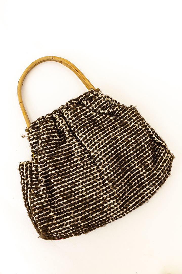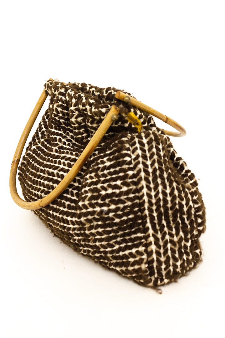 Leuke vintage handtas met handvatten van bamboe. Het tasje is gemaakt van geweven stof in bruine en witte tinten. De binnenzijde is gevoerd met geel velours. Deze tas heeft een groot vak met twee kleine vakjes aan de binnenzijde. Het tasje is in goede vintage staat.