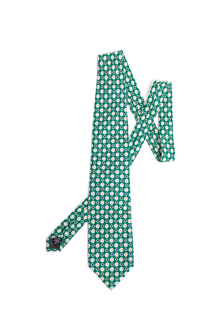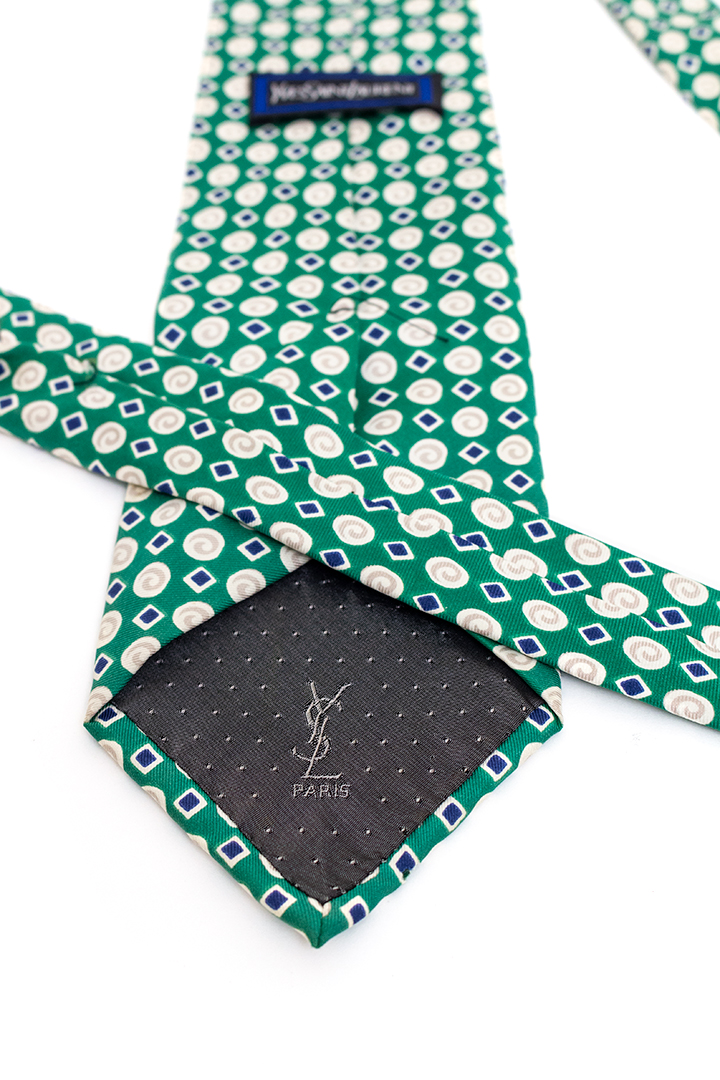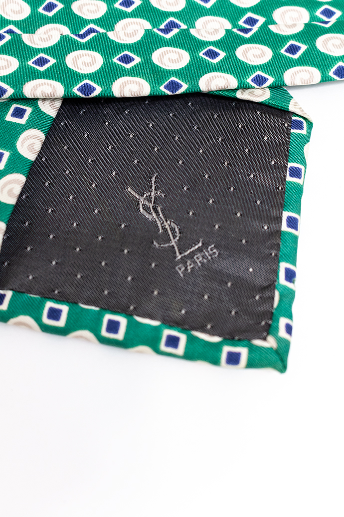 Leuke vintage stropdas van het Franse modemerk Yves Saint Laurent. De das is gemaakt van zijde en heeft een opvallende kleur groen. Het patroon bestaat uit crèmekleurige cirkels met een ‘swirl’ en donkerblauwe ruitjes. De stropdas is gevoerd. Aan de achterzijde zien we het originele label en een geborduurd logo van Yves Saint Laurent.