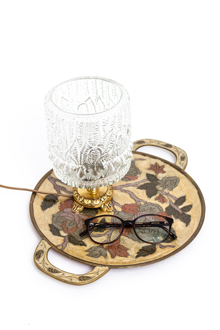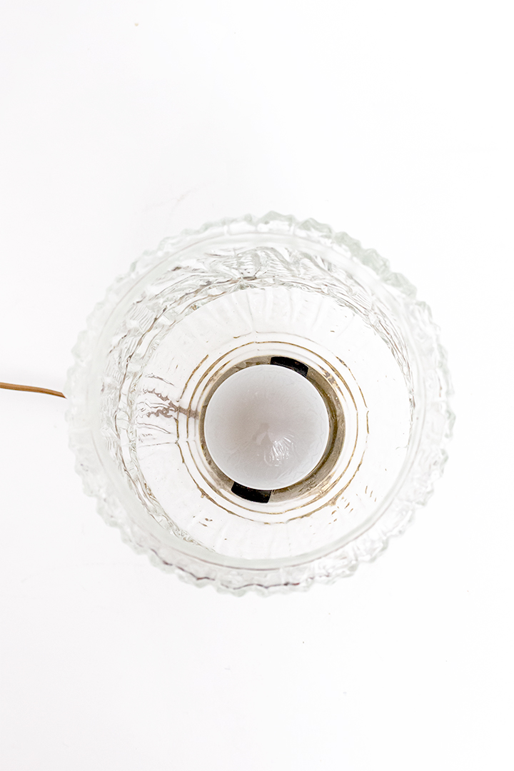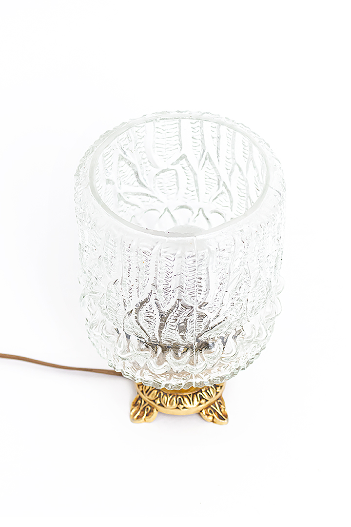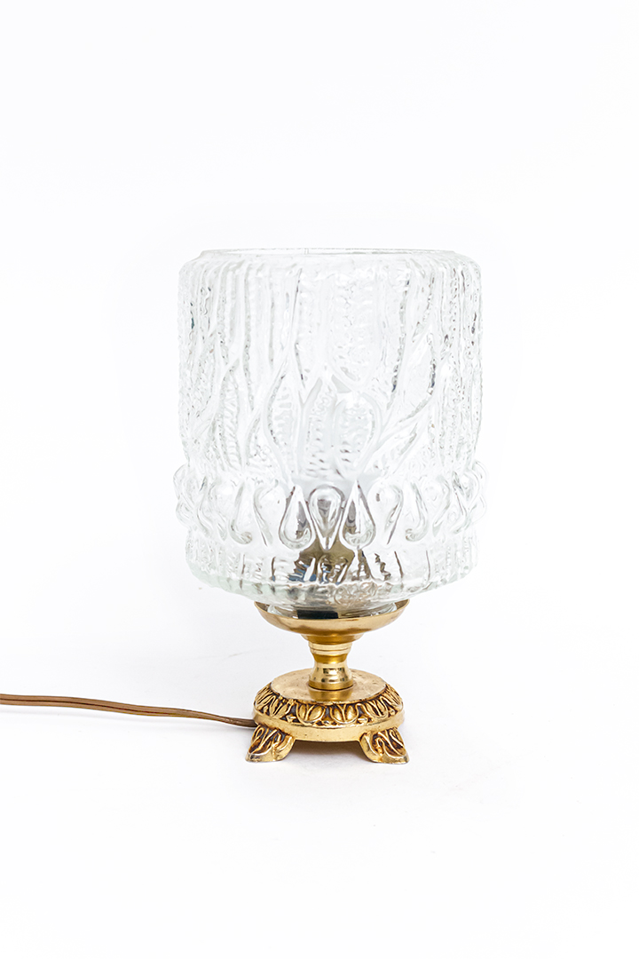 Met deze tafellamp geef je een elegante vintage touch aan je interieur. Het lampje heeft een glazen kap met reliëf. Deze spreidt het licht prachtig door de ruimte. Het messing voetje is bewerkt en voorzien van pootjes. Het lampje is klein van stuk en perfect als sfeermaker op je nachtkastje of naast de bank. We brachten dit tafellampje voor je mee uit het Zuiden van Frankrijk!