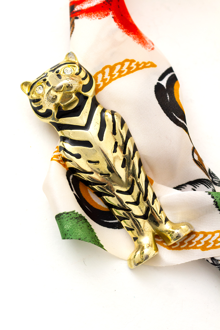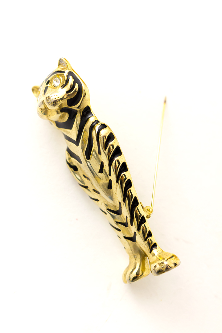 Deze leuke vintage broche heeft de vorm van een tijger. Het diertje komt uit de jaren 80 of 90 en is gemaakt van goudkleurig metaal met zwarte emaille accenten. Opvallend aan dit sierraad zijn de glimmende ogen van strass steentjes. Draag de tijger op je borst, tas of als grote speld om een vest of sjaal mee dicht te doen. Hij staat op veel outfits goed!