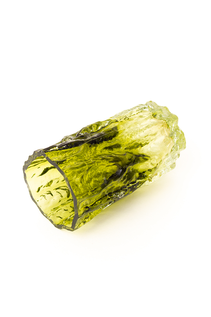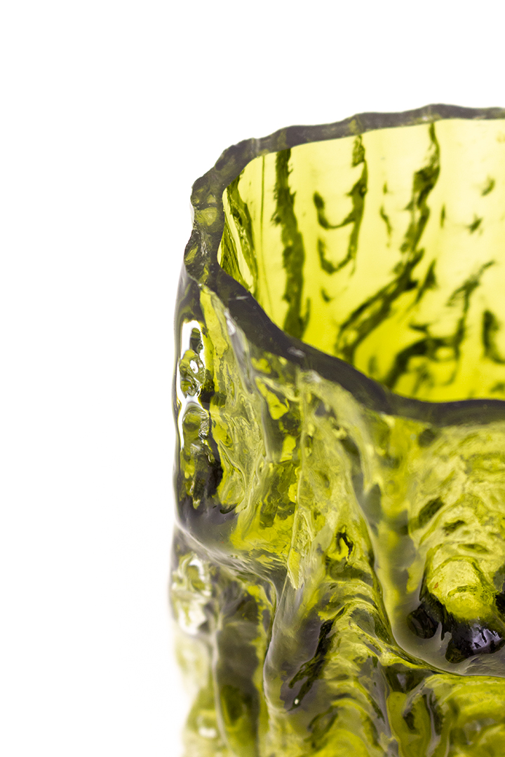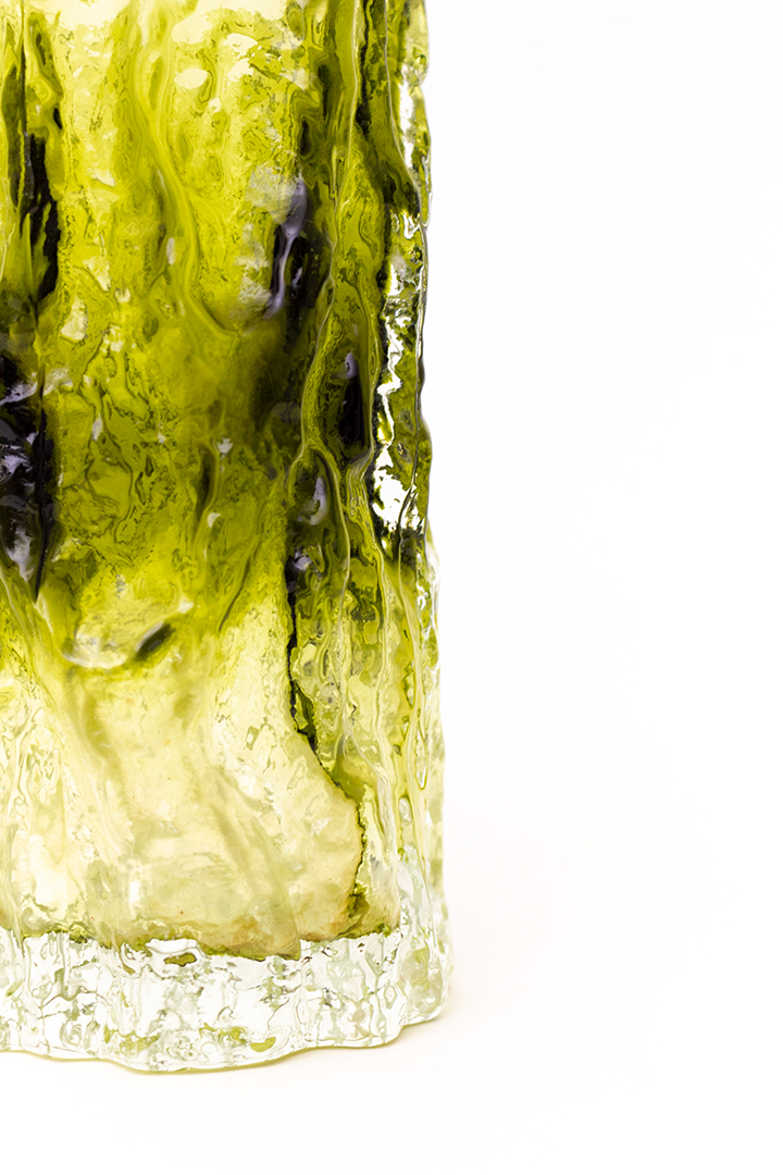 Deze mooie (en voor zijn soort vrij grote) vintage vaas is in de jaren 70 ontworpen door Ingrid Glas. De vaas is gemaakt van zwaar kristalglas in een groene tint. De kleur verloopt in een subtiele gradiënt, het groen is langs de onderzijde lichter dan bovenin. Het meest opvallend aan deze bijzondere vaas is echter de robuuste vorm en grillige textuur. Het glazen oppervlak heeft een reliëf dat erg lijkt op boomschors. Dit soort ‘textured bark vases’ waren enorm populair in de jaren 70. Ze zijn prachtig als decoratief object, maar je kunt er natuurlijk ook een bloemetje in zetten.