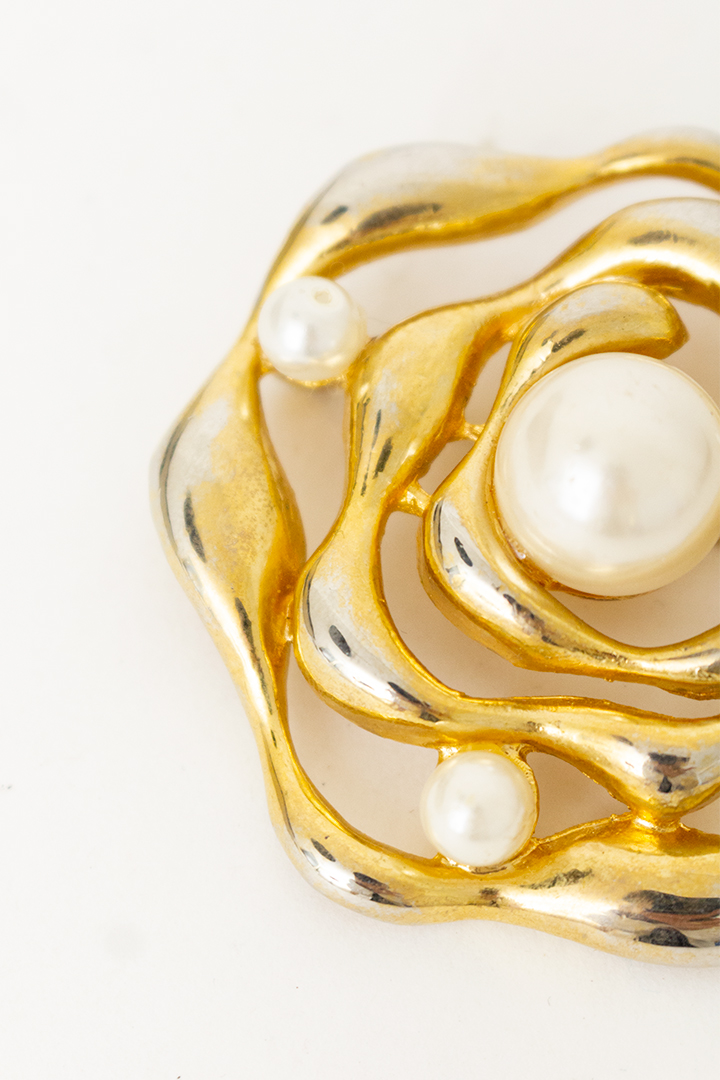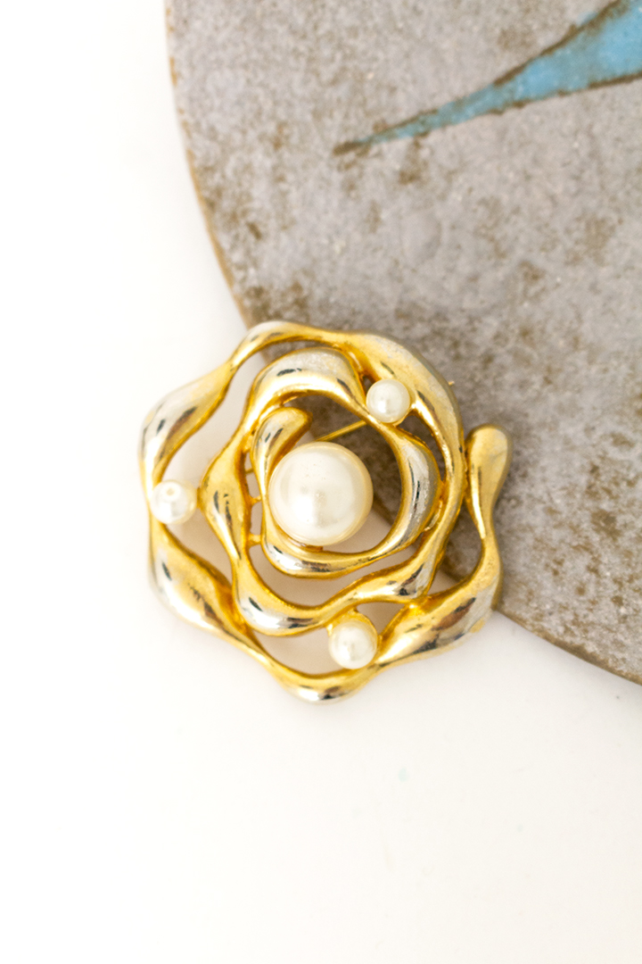 Leuke vintage broche van verguld metaal. Deze broche komt uit Frankrijk en is in goede vintage staat. Het ontwerp lijkt op een bloem, in de swirl zitten diverse kunststof pareltjes verwerkt. Draag dit sieraad op een blouse of speld hem op de revers van een jasje. Zo geef je wat vintage allure aan je outfit!