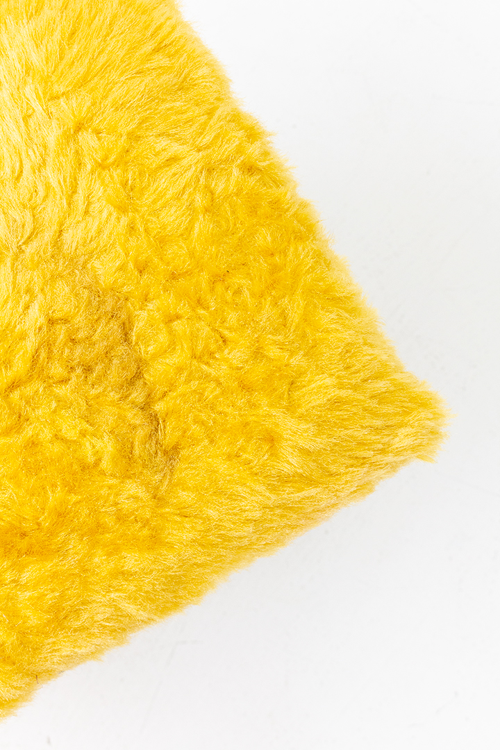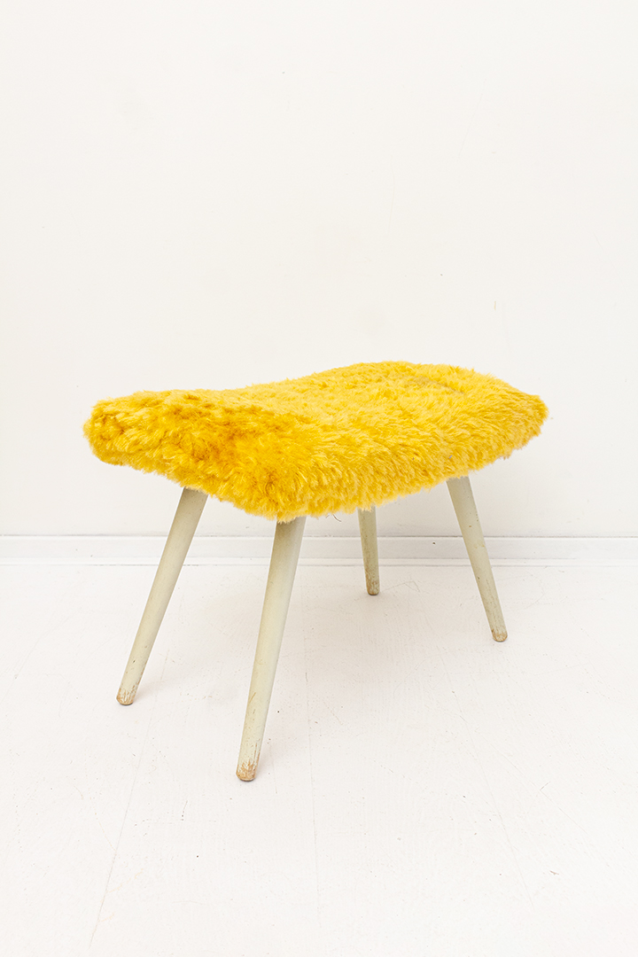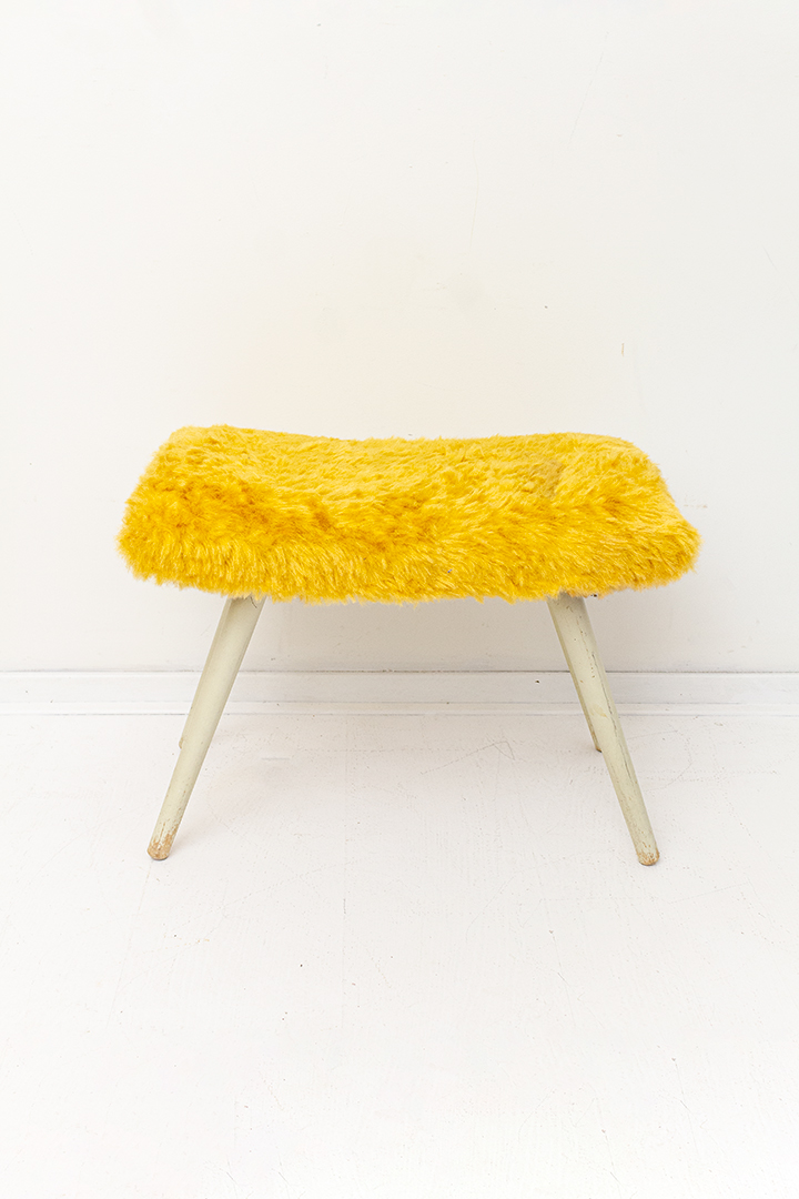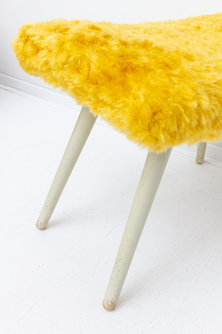 Vintage voetenbankje met gele furry stof en houten pootjes