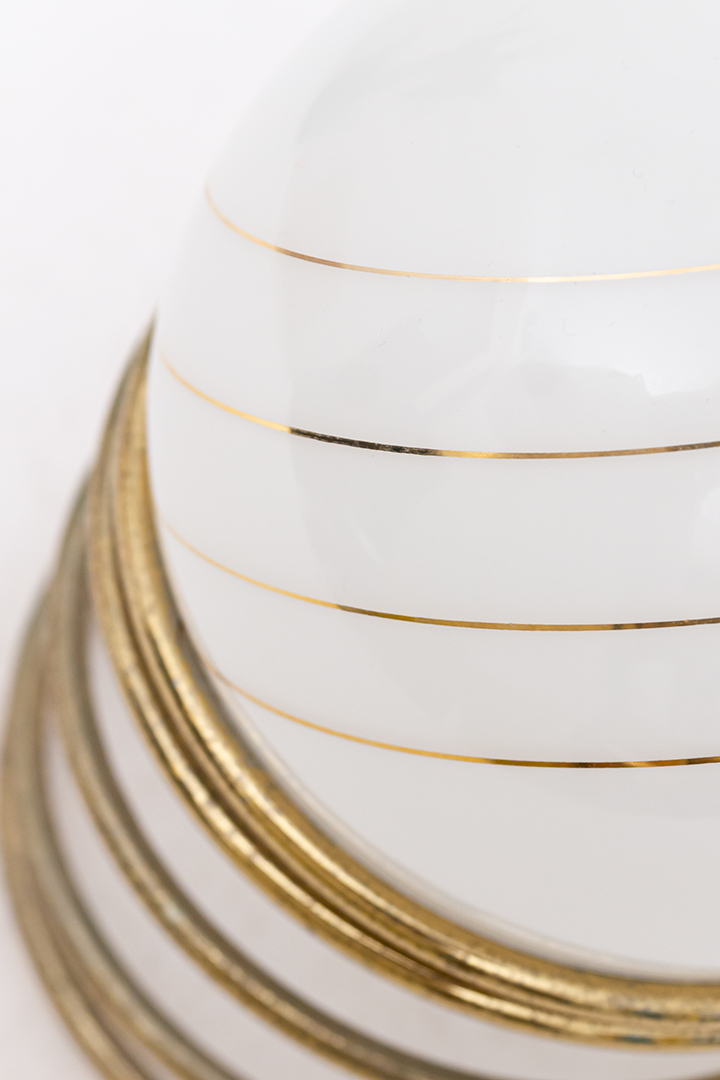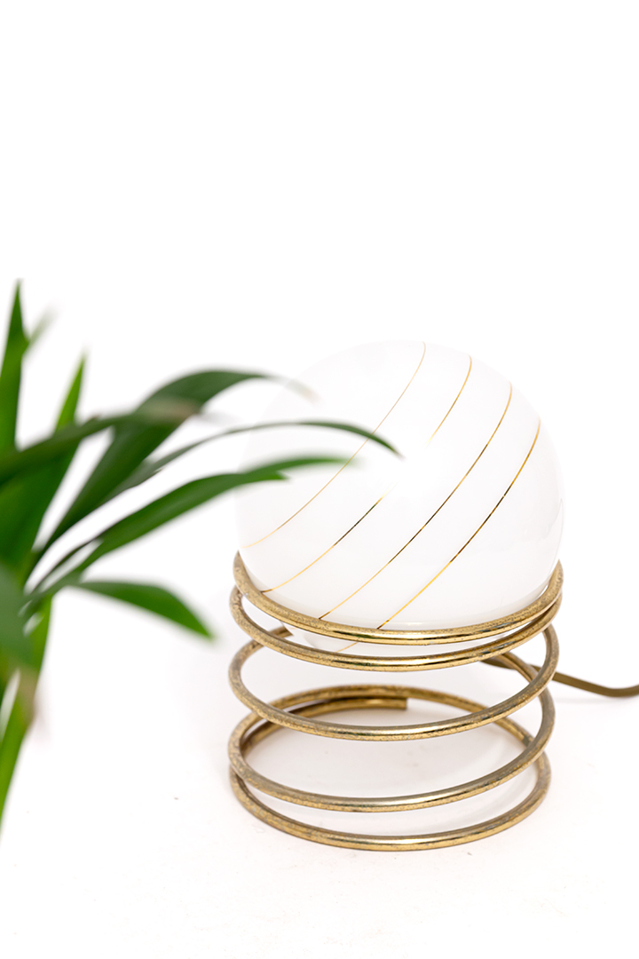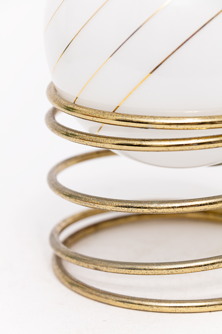 Deze vintage tafellamp lijkt op de originele Woja spiraallamp ontworpen door Ingo Maurer. Dit exemplaar is echter in de jaren 80 gemaakt door het Belgische bedrijf Massive. De tafellamp bestaat uit twee delen. Het onderstel wordt gevormd door een goudkleurige metalen veer met daarop een glazen bol als lampenkap. De bol is opaal en heeft drie goudkleurige strepen die het ontwerp een interessant lijnenspel geven. De glazen bol ligt los op het spiraal en kun je draaien zoals je zelf mooi vindt.