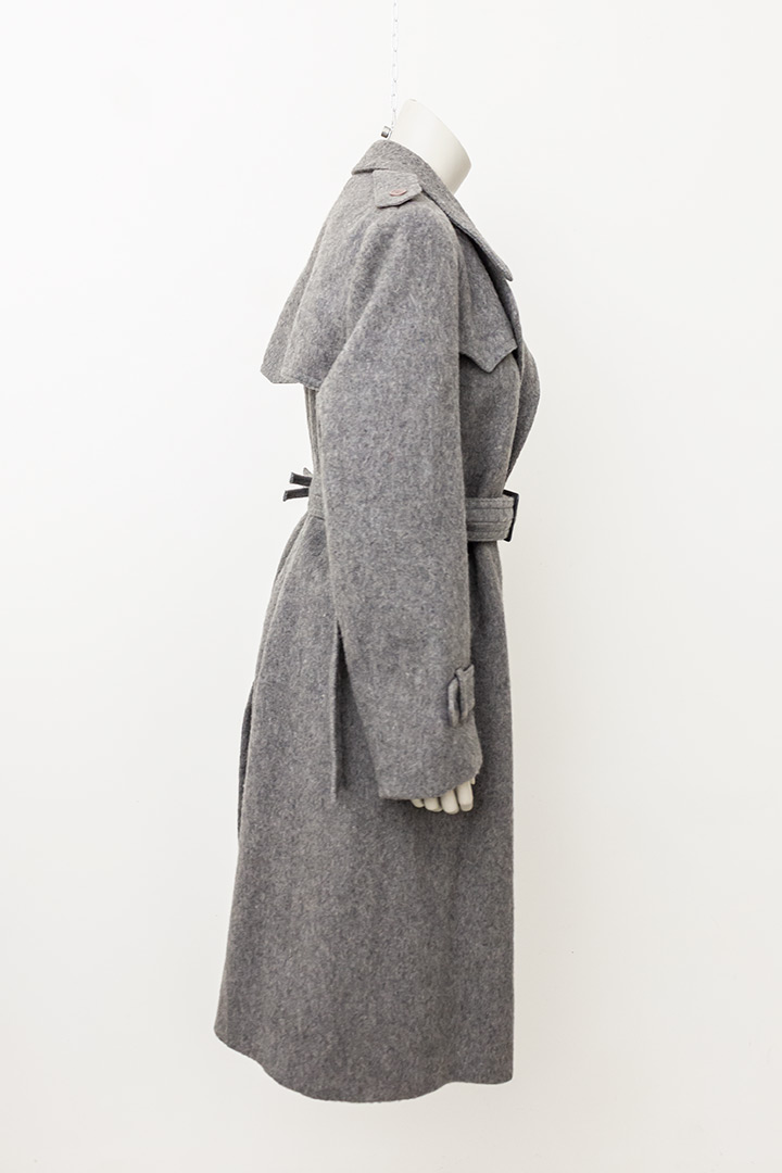 Mooie vintage wollen trenchcoat uit de jaren 70. Deze grijze jas heeft een flinke kraag en afneembaar ceintuur. Er zijn epauletten op de schouders en twee steekzakken. Aan de achterzijde is daarnaast nog een leuk strik-achtig detail zichtbaar. Deze vintage winterjas oogt erg luxe en valt heel elegant.