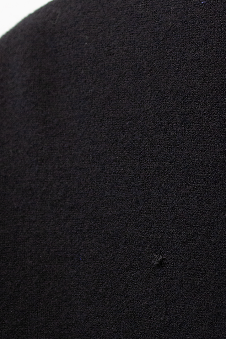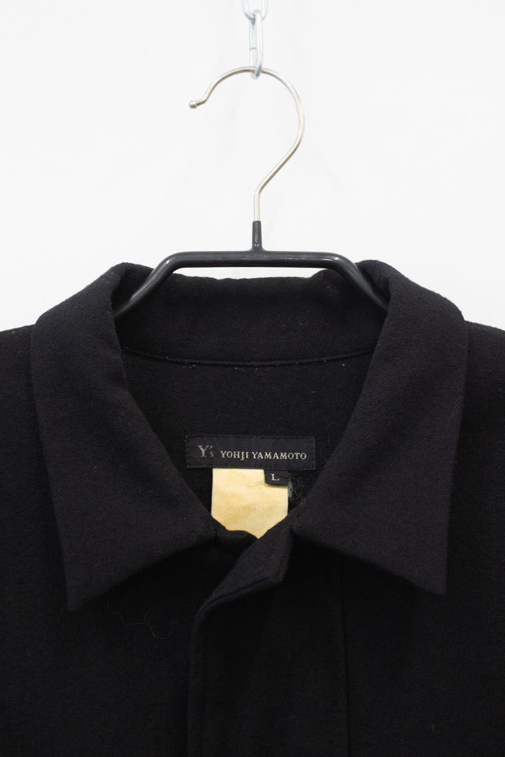 Deze zwarte wollen blouse is afkomstig uit het modehuis van Japans mode-icoon Yohji Yamamoto. De zwarte blouse heeft een klassieke look met een tijdloze flair. Door de rauwheid van de wol en de brede knoopbies, krijgt de blouse een geheel eigen karakter. De blouse is van binnen op een hoogwaardige manier afgewerkt met jeans-naden. De sluiting is gemaakt van houten knopen. Doordat elke knoop van een ander deel van het hout is gemaakt, heeft elke knoop ook een eigen karakter. De knopen zijn zwart en hebben hier en daar bruin gemêleerde vlekjes van de houtnerven.