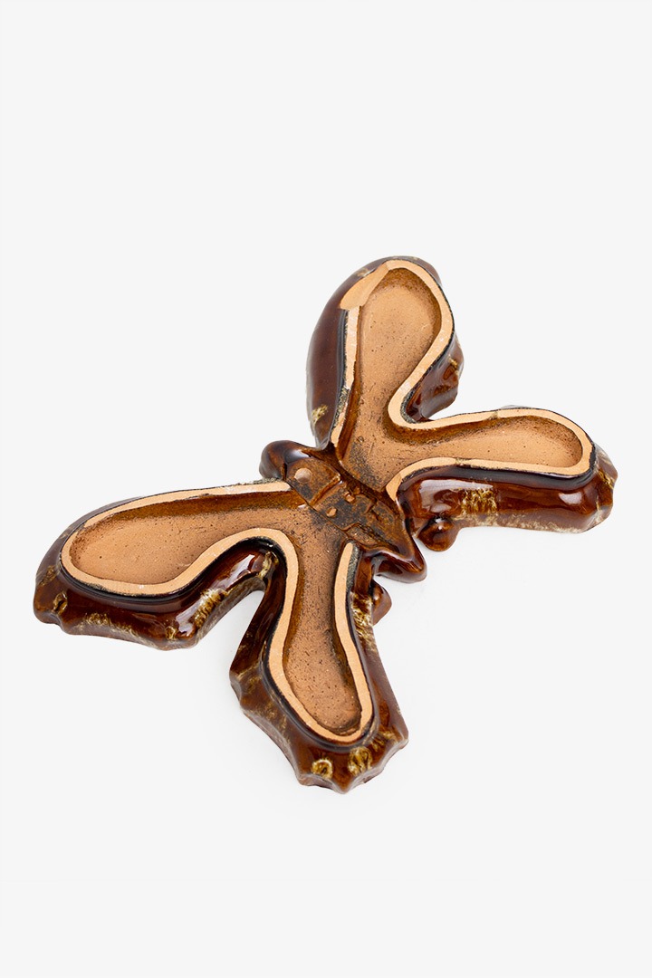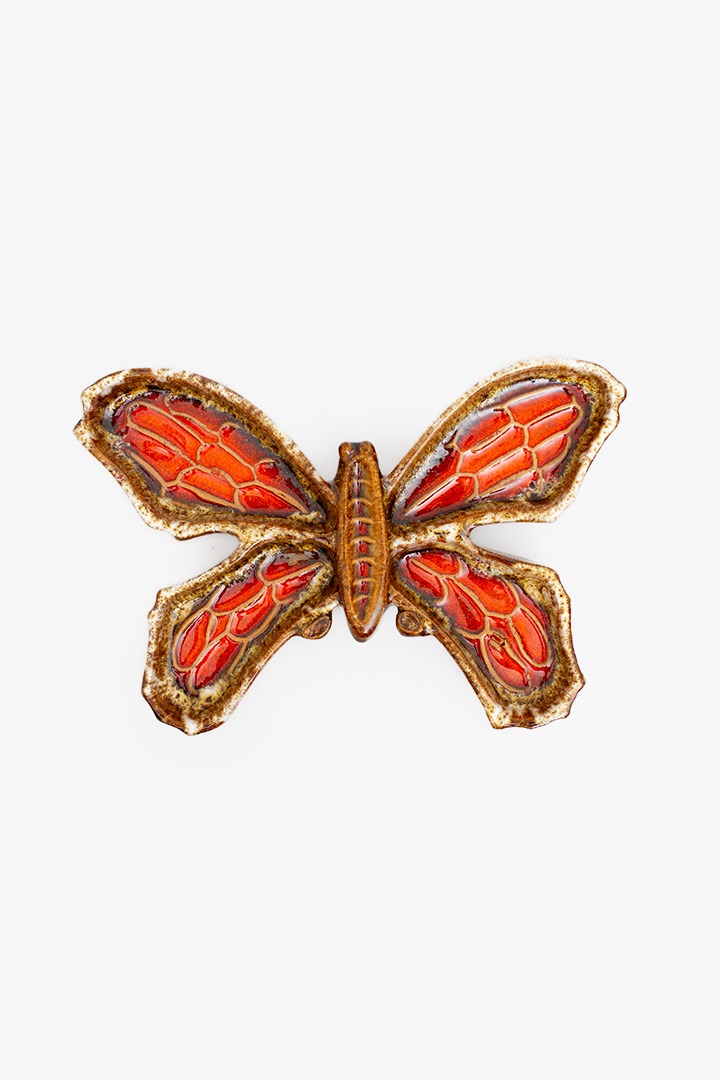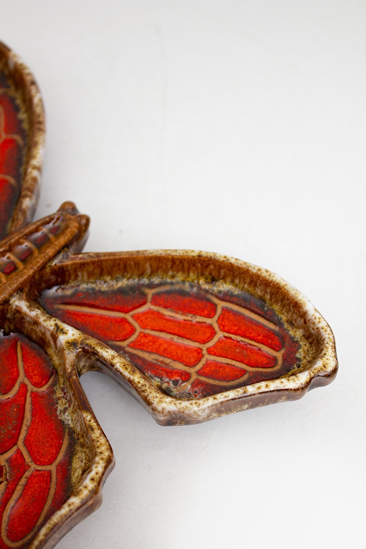 Deze prachtige bruine met rode keramieken vlinder heeft alle karakteristieke eigenschappen die West-Germany keramiek zo mooi en gewild maakt. De kleuren die onregelmatig zijn aangebracht maken dit een echte eyecatcher voor op tafel of aan de wand. Het decoratieve object is heel veelzijdig. Je kunt hem bijvoorbeeld gebruiken als ringenbakje maar staat net zo mooi in de vitrine of hangend bij de voordeur.