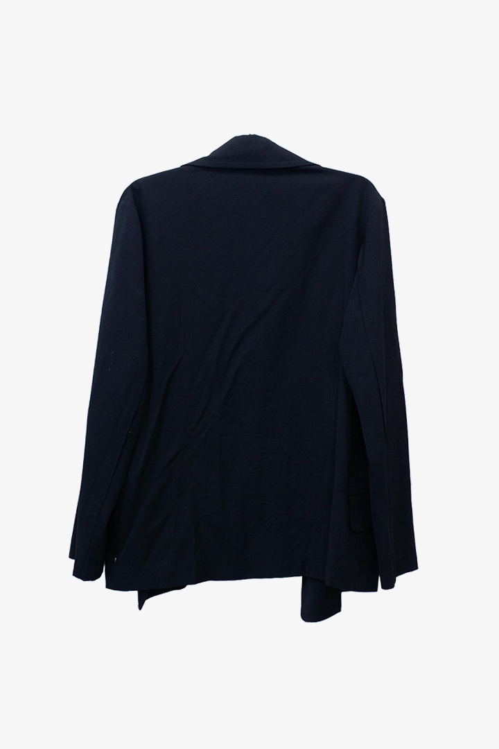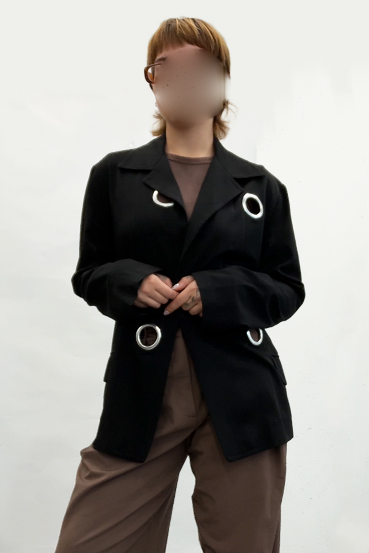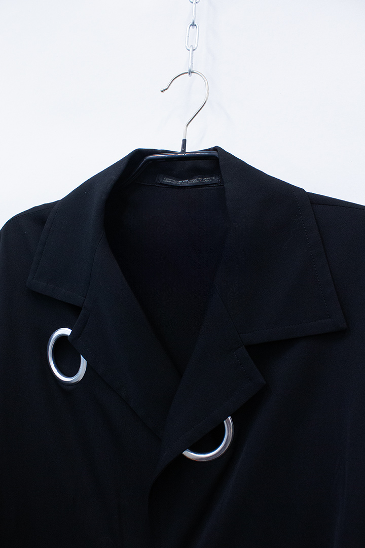 Dit tijdloze jasje/ vestje met hardware details is afkomstig uit het modehuis van Japans mode-icoon Yohji Yamamoto. Het zwarte jasje heeft een avantgardistische look met stoere design elementen. Het dunne wollen jasje heeft grote lapellen, zoals je dat vaak ziet bij blazers en is gedecoreerd met 4 opvallend grote zilveren zeilringen, wat het vestje een geheel eigen karakter geeft. Vanbinnen is het jasje afgewerkt met platgestreken omgezoomde naden en een beleg. Het jasje heeft twee zakken en geen sluiting. Het kan dus open worden gedragen of rijg een mooie sjaal door de zeilringen heen om het jasje te personaliseren naar eigen smaak!