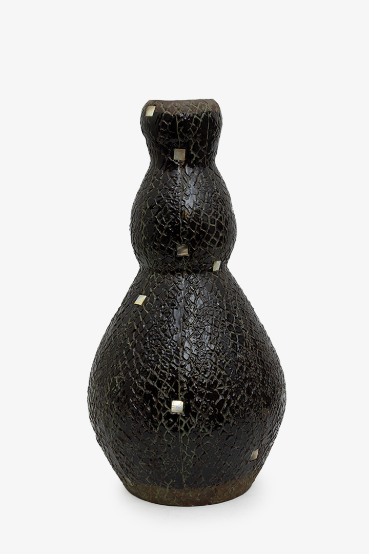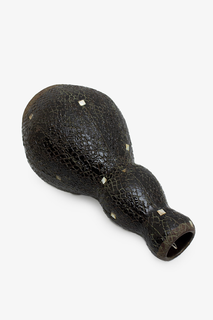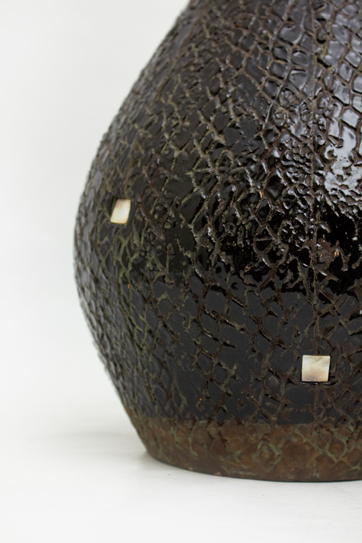 Bijzondere handgemaakte keramieken vaas met een unieke structuur. De vaas is opgebouwd in een gelaagde, dubbelbolle vorm. De buitenzijde is rijkelijk versierd met een sgraffito-patroon dat doet denken aan een slangen- of netstructuur, in combinatie met kleine ingelegde vierkantjes van parelmoer.