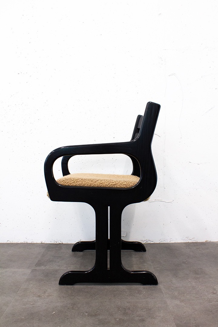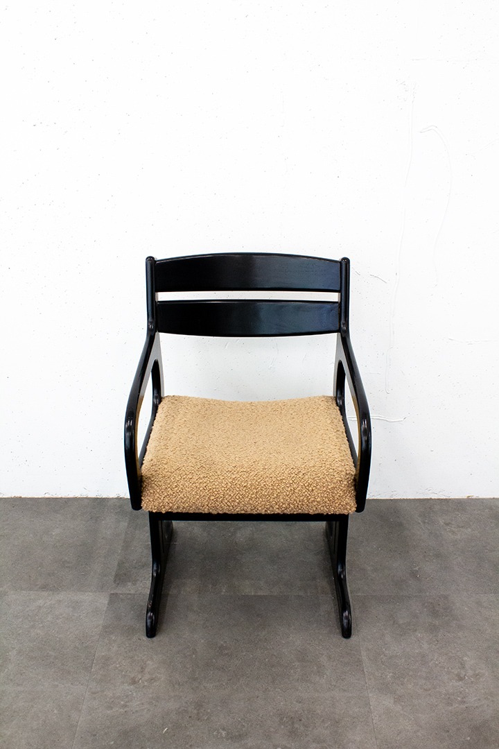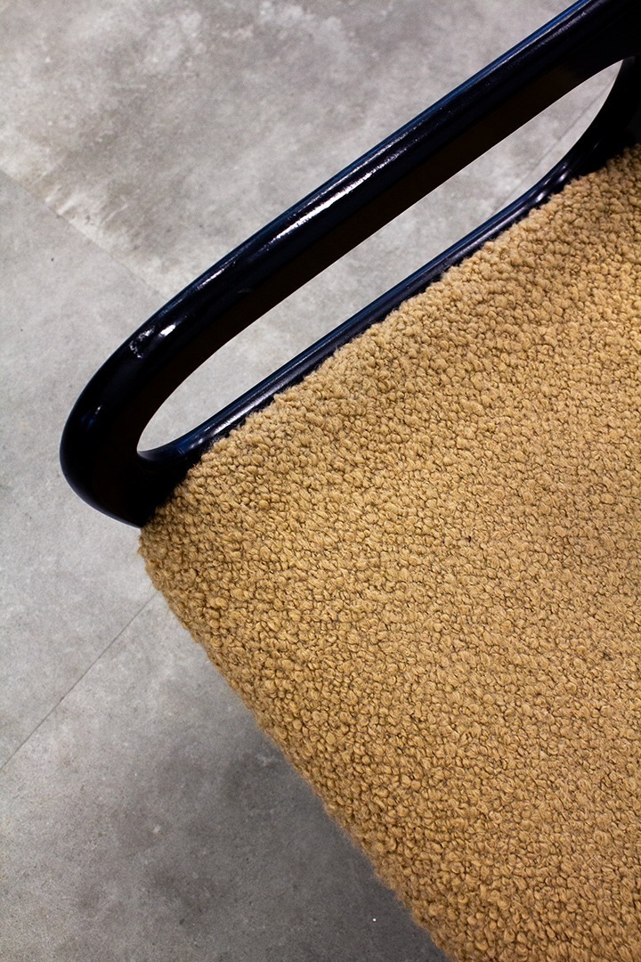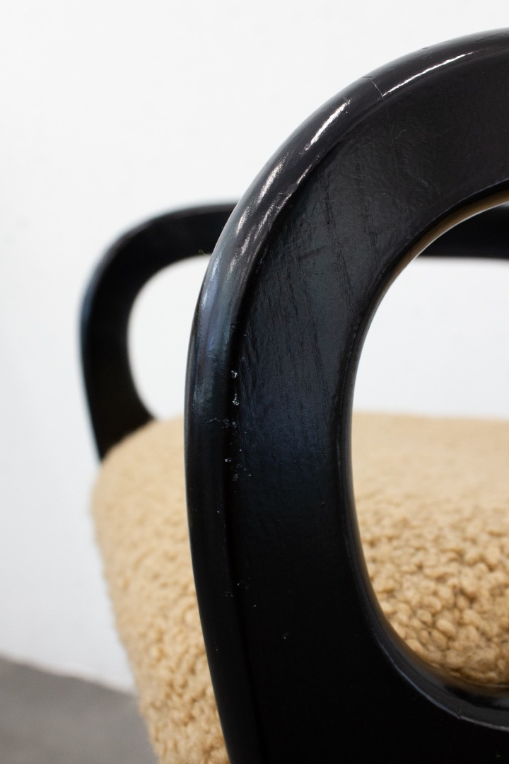 De verf op de stoel is iets versleten, maar de stoel is voor de rest in uitstekende vintage staat! De stoel is opnieuw bekleed met bouclé stof.