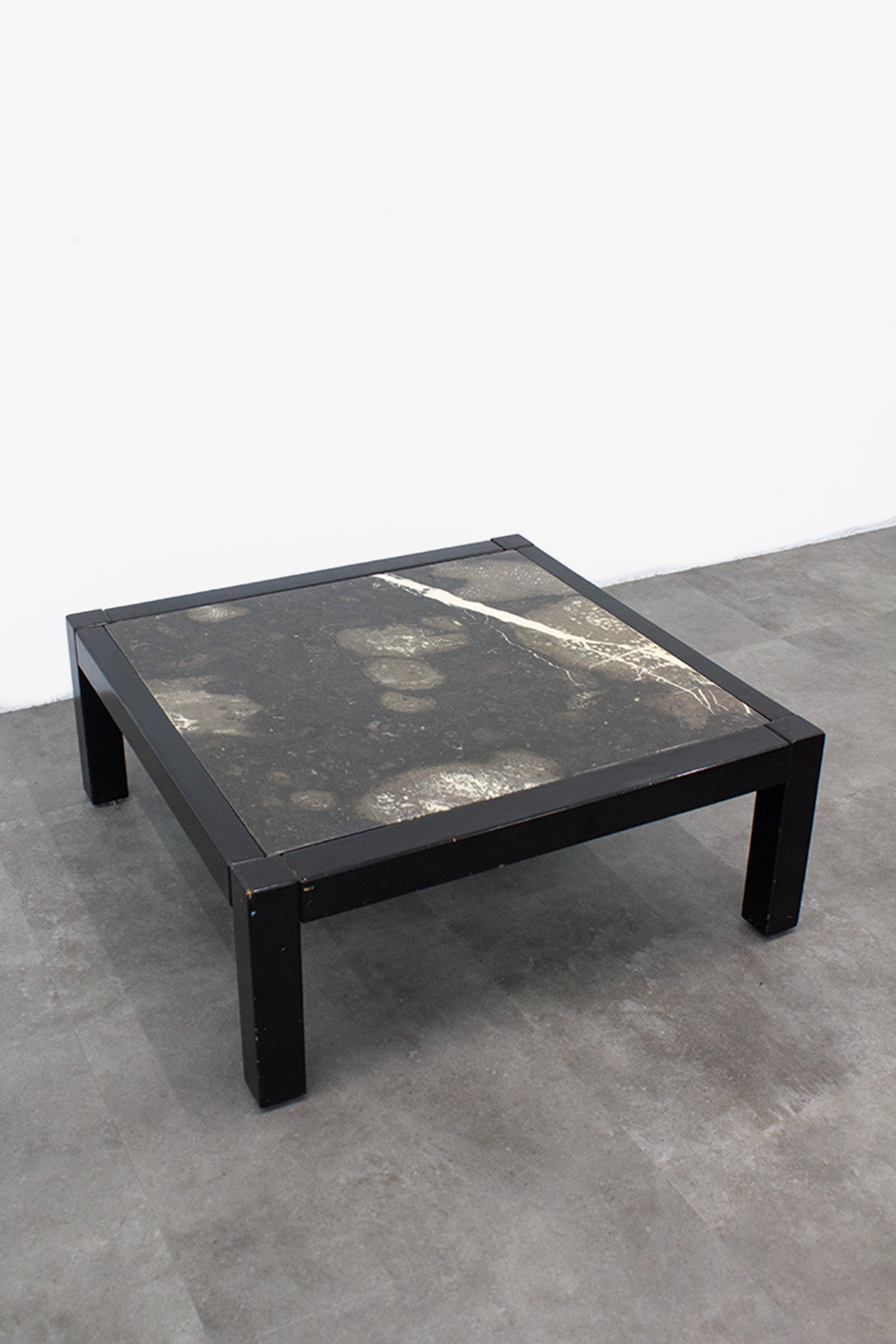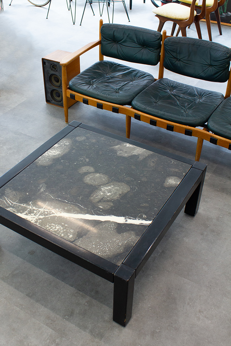 Strakke vintage salontafel met een massief houten frame en een zwaar marmeren blad. De diepe kleurtonen en natuurlijke aders in het marmer geven het geheel een stoere, luxe uitstraling.