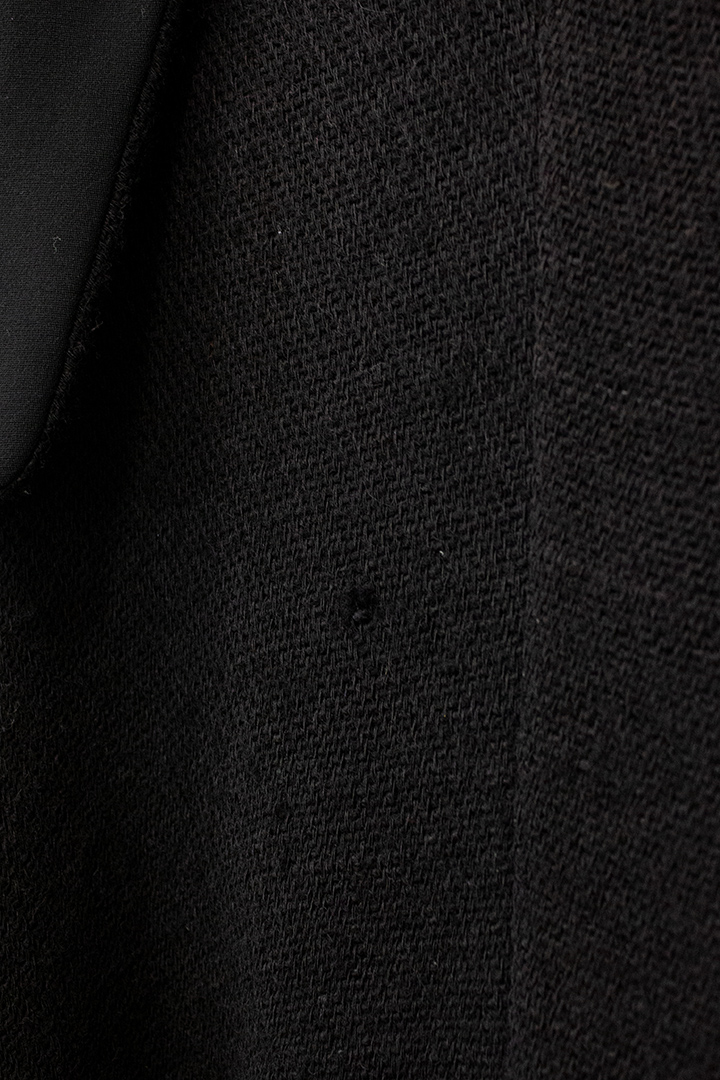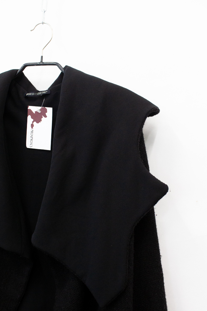 Deze waanzinnige sculpturale jas/ vest met stoere details is afkomstig uit het modehuis van Japans design-icoon Yohji Yamamoto. De zwarte jas heeft een avantgardistische look met quirky design elementen. De dikke zwarte wollen jas heeft lage mouwen waardoor de jas/ vest je met zijn oversized model volledig inpakt. Voor het gemak heeft de jas 2 binnenzakken. De contrasterende stoffen die gebruikt zijn, versterken elkaar en zorgen voor een onverwachte combinatie. Het meest opvallende design element is natuurlijk de kraag die is gevormd naar de vleugels van een vleermuis. Een quirky detail dat gek genoeg heel klassiek oogt.
