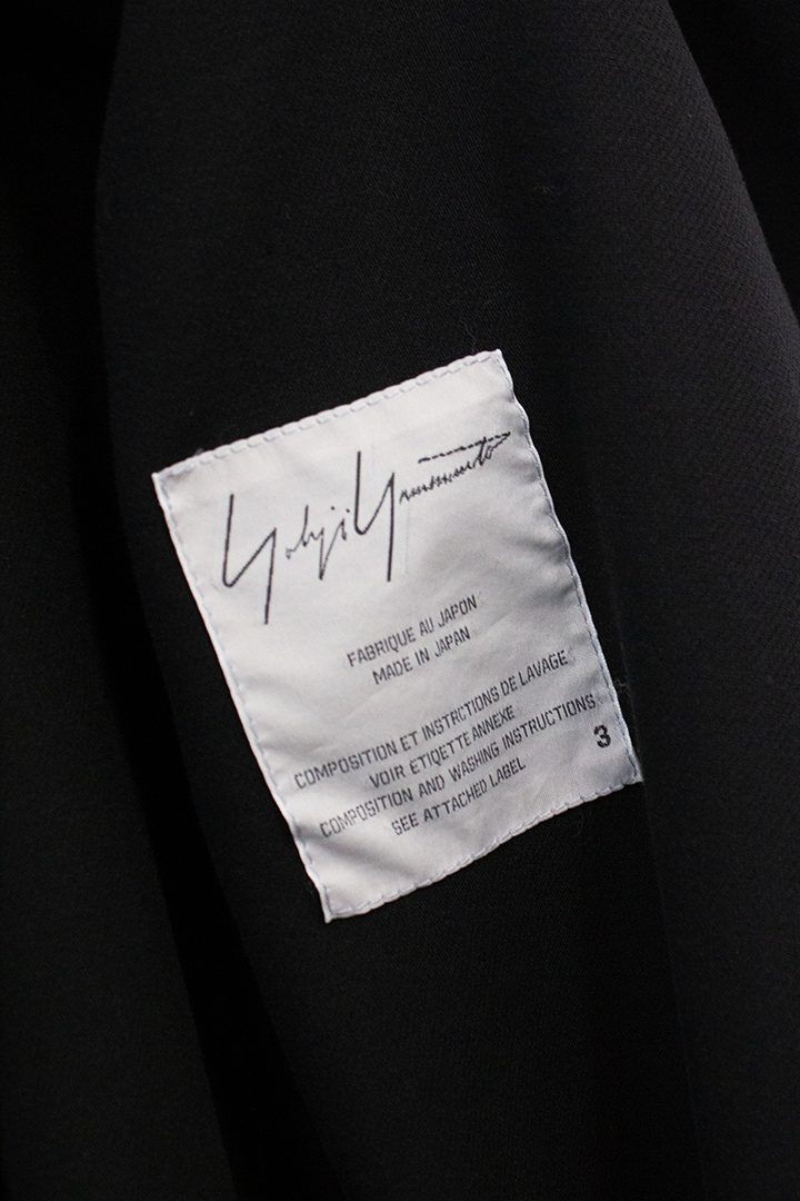 Deze jas is een goed voorbeeld van Yamamoto’s werk. Zijn kledingstukken hebben meestal oversized elementen en zijn voorzien van sierlijke draperieën in verschillende texturen. Yamamoto’s collecties zijn overwegend zwart en donkergrijs, kleuren die hij omschrijft als bescheiden en arrogant tegelijk. Zwart en donkergrijs hebben iets makkelijks en mysterieus, aldus de Japanse ontwerper.