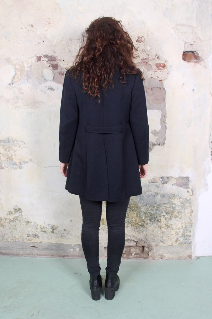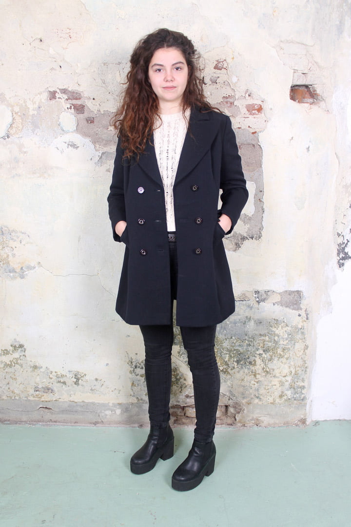 Vintage zwarte wollen trenchcoat. Getailleerd en met dubbele rij knopen. In maat M. De jas is zwart maar lijkt in een bepaald licht ook wel diep donkerblauw.